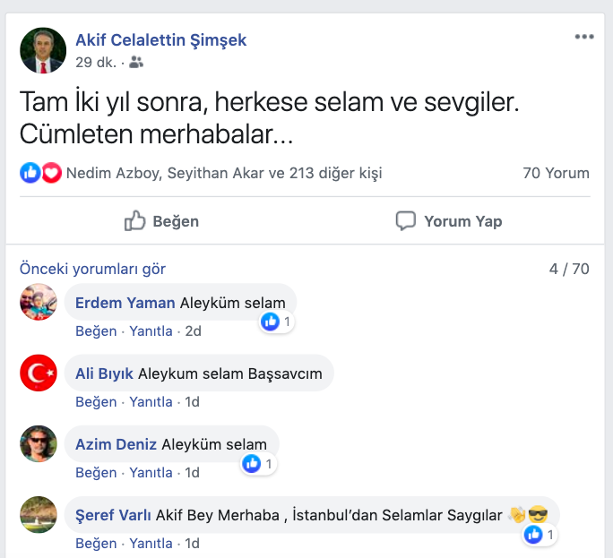 Akif Celalettin Şimşek, bugün Facebook sayfasını yeninden aktif ederek takipçilerine bir mesaj verdi. Şimşek, geri dönüş kararını şu sözlerle duyurdu: “Tam İki yıl sonra, herkese selam ve sevgiler. Cümleten merhabalar...”