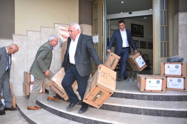 Fakir ve başarılı öğrencilerin ayaklarını kış boyunca sıcak tutacak botların bulunduğu kolileri sırtlanan okul müdürleri Ticaret Borsa binasından mutlu şekilde ayrıldılar.