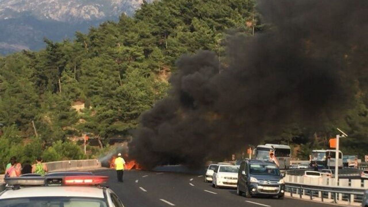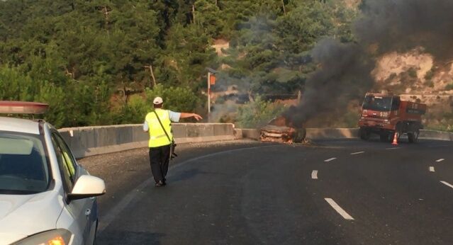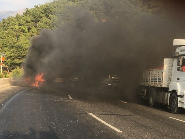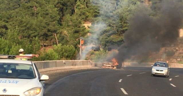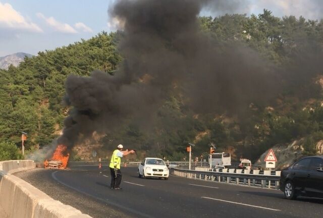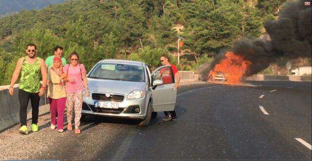 Manisa - İzmir yolu üzerinde tatilden dönen 4 kişilik bir aile, seyir halindeyken aniden yanmaya başlayan otomobilden son anda kendilerini dışarı atarak yanmaktan kurtuldu.