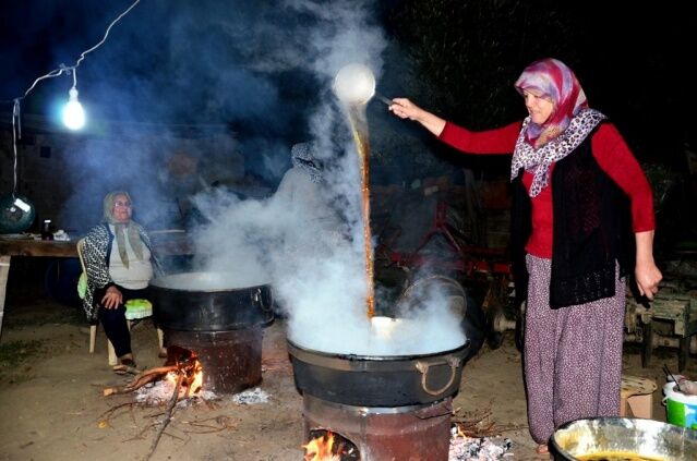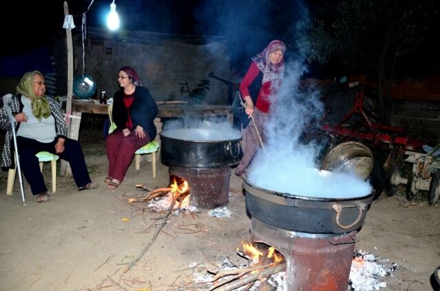 Manisa'nın Sarıgöl ilçesinde yaşayan ev kadınları ilçenin dünyaca ünlü üzümlerinden imece usulü pekmez yapıyor.