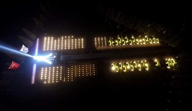 Faciada hayatını kaybeden maden işçilerini temsilen yapılan 301 LED aydınlatma kaidenin sonunda birleşerek gökyüzüne yansıtılıyor.