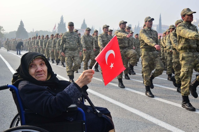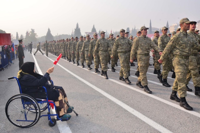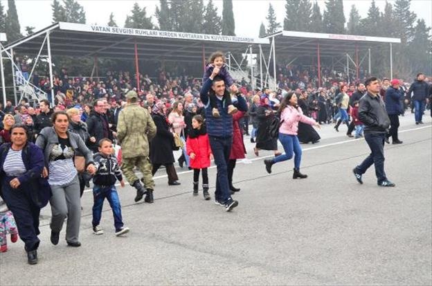 Albay Şefik Güvenç'in konuşmasının ardından askerler marşlar eşliğinde geçit töreni yaptı. Marşlara eşlik eden aileler de askerleri alkış yağmuruna tuttu. Tekerlekli sandalyesiyle torununun yemin törenine katılan 80 yaşındaki Biyansi Taşkıran da, Türk bayrağı salladı. Geçit töreninin ardından yemin eden askerlerle aileleri birbirlerine kavuştu. Oğullarına kavuşan anne ve babalar gözyaşlarına hakim olamadı.