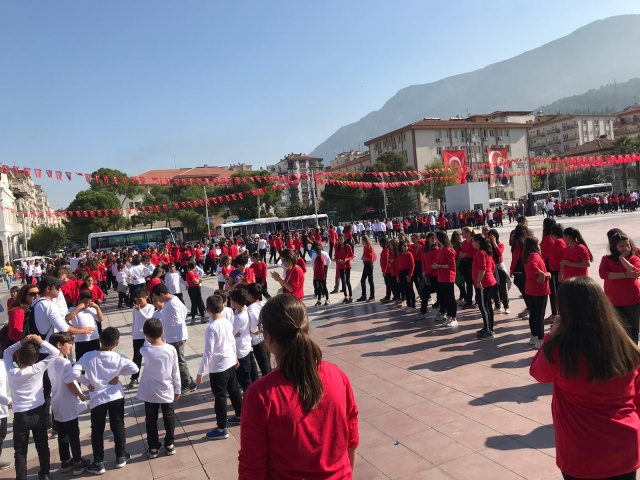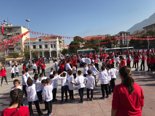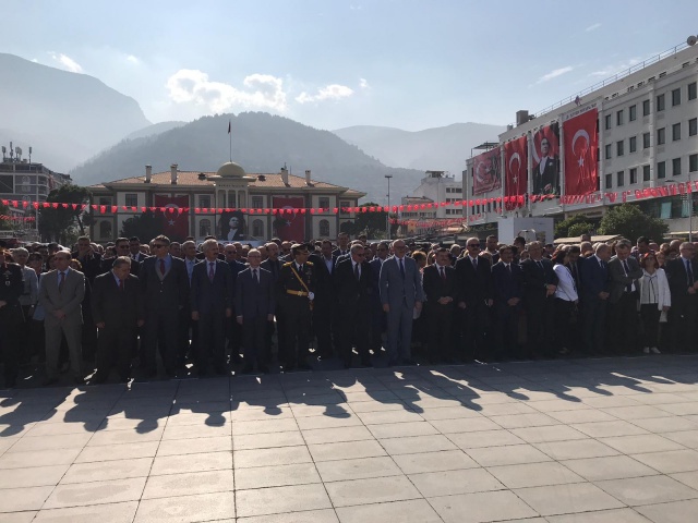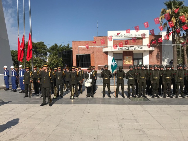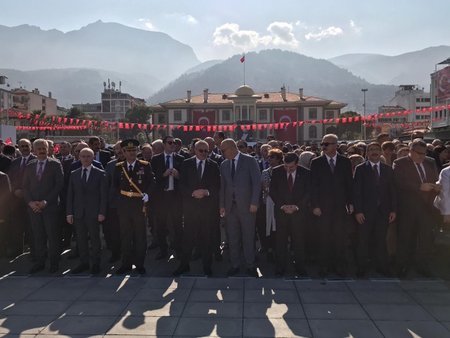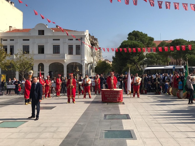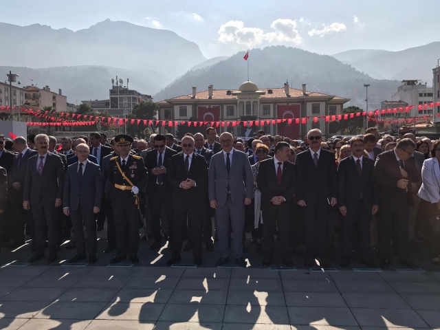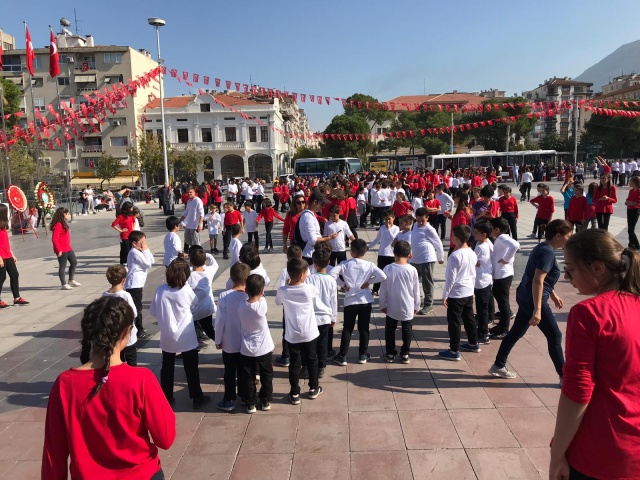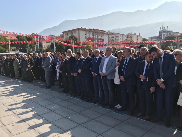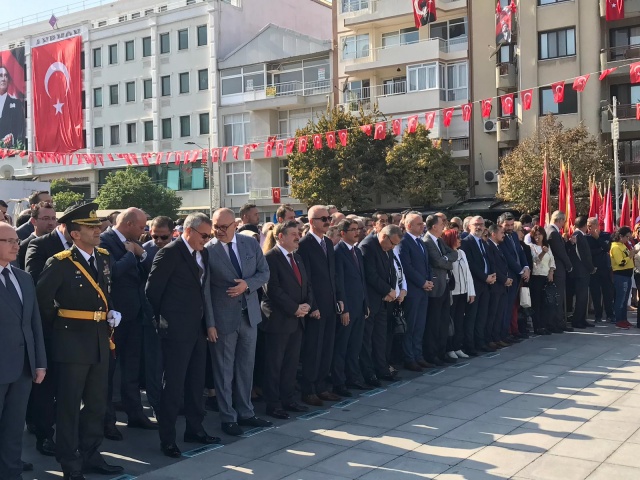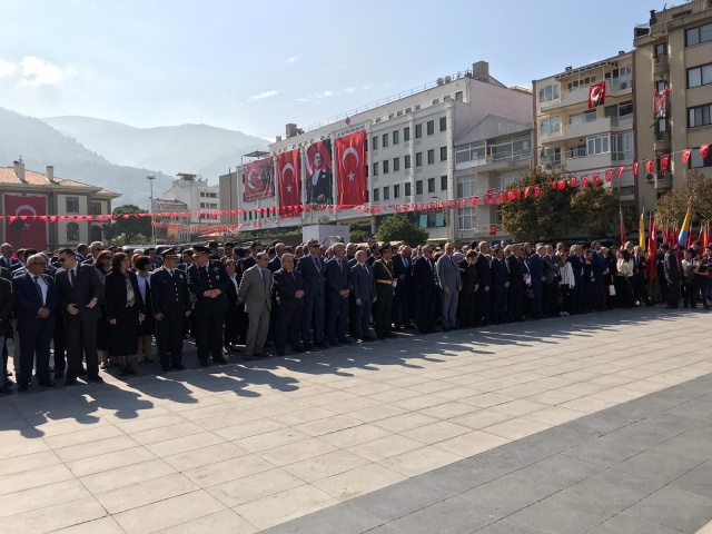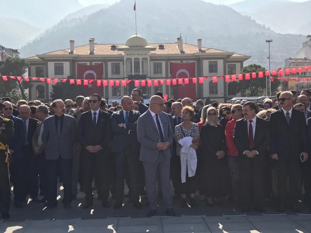 Manisa'da Cumhuriyet Bayramı programı Cumhuriyet Meydanı Atatürk ve Milli Eğitim Anıtı önünde çelenk sunumuyla başladı.