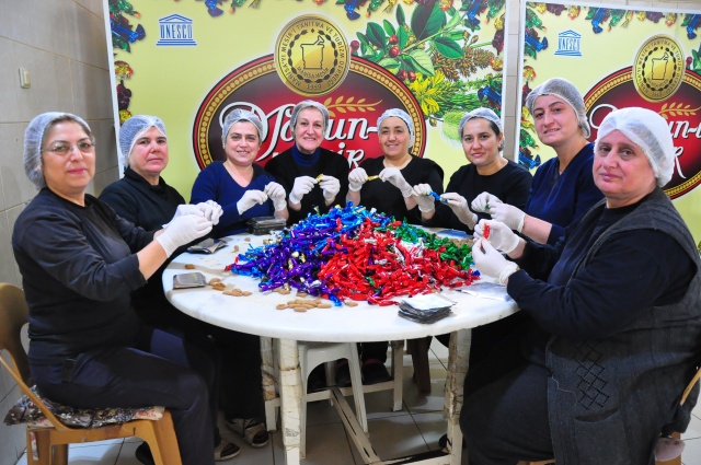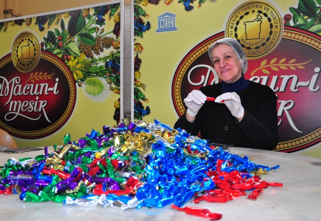 Hiçbir teknoloji kullanmadan ve erkek eli değmeden 15 kadın tarafından Manisa’yı Mesir’i Tanıtma ve Turizm Derneği imalathanesinde hazırlanan mesir macunları, tek tek işlendikten sonra kağıtlara sarılıyor.
