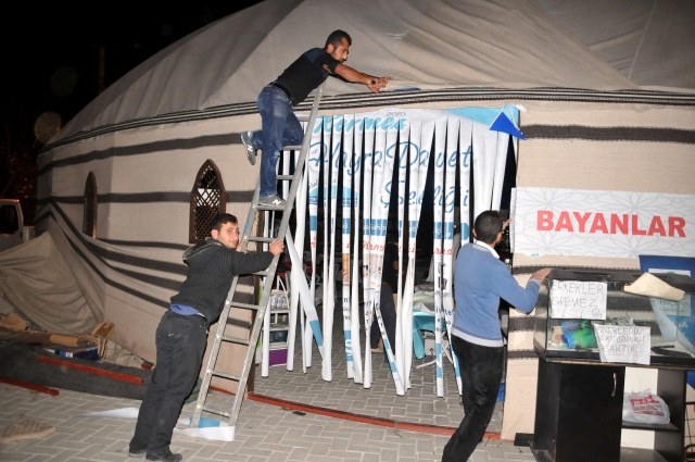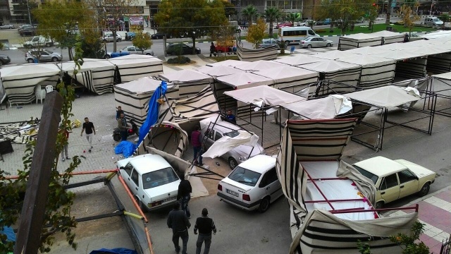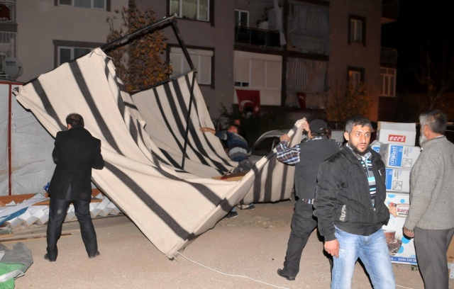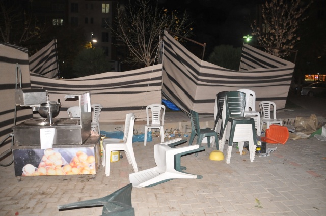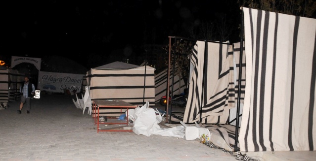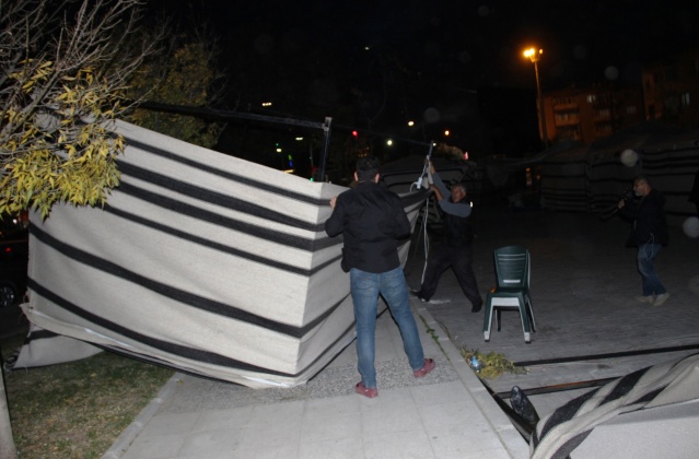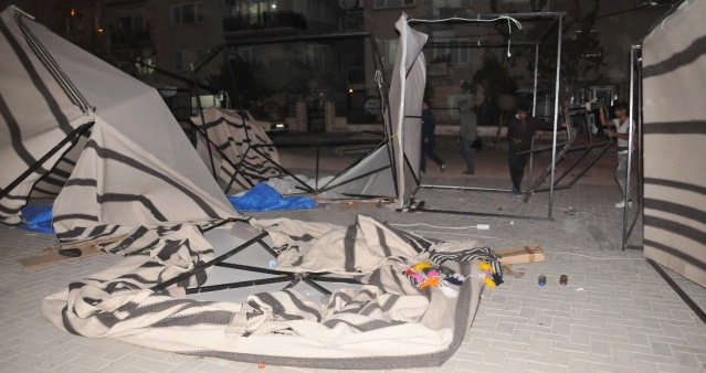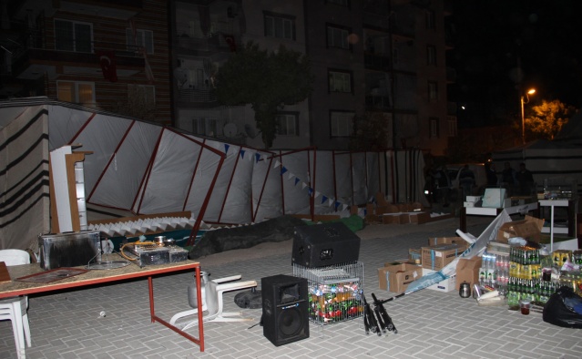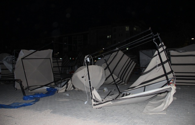 Manisa’nın Yunusemre ilçesine bağlı Hafsa Sultan Mahallesi’nde kurulan kermes çadırları şiddetli lodosa dayanamadı. Profil demirlerinden sıyrılan çadırlar etrafa savruldu. Vatandaşların hemen boşalttığı kermes çadırları, sahipleri tarafından toplanmaya başlandı.