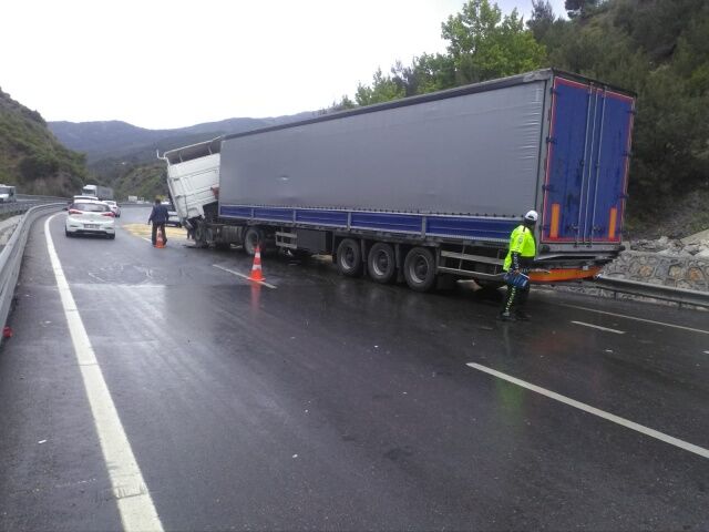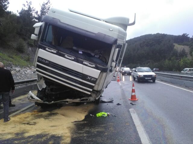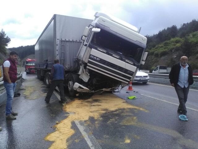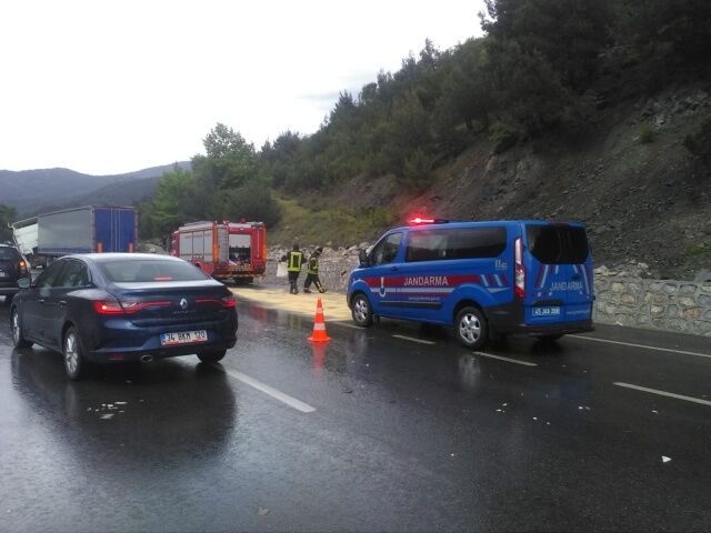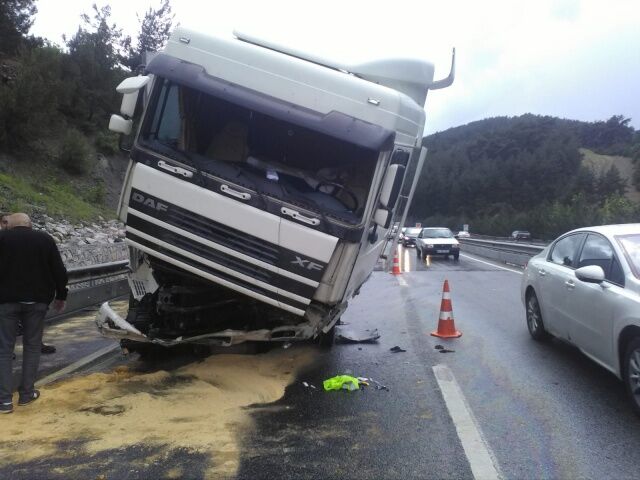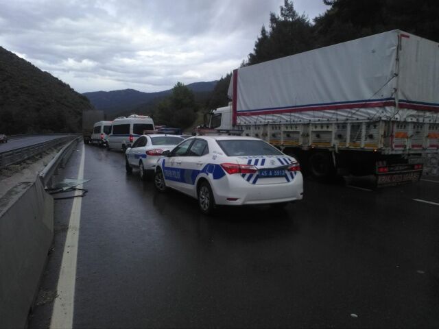 Edinilen bilgiye göre Manisa yönünde seyir halindeki Kaan Yüceli idaresindeki tır ile Turgay Narcılar yönetimindeki 35 AH 3923 plakalı kamyonet yağmur sonrası kayganlaşan yolda çarpıştı. Kaza sonrası iki araç sürücüsü de yaralandı. Trafikte kısa süreli aksama yaşandı. Olay yerinde çok sayıda ilk yardım ve trafik ekibi sevk edildi. Jandarma ekipleri kazayla ilgili soruşturma başlattı.