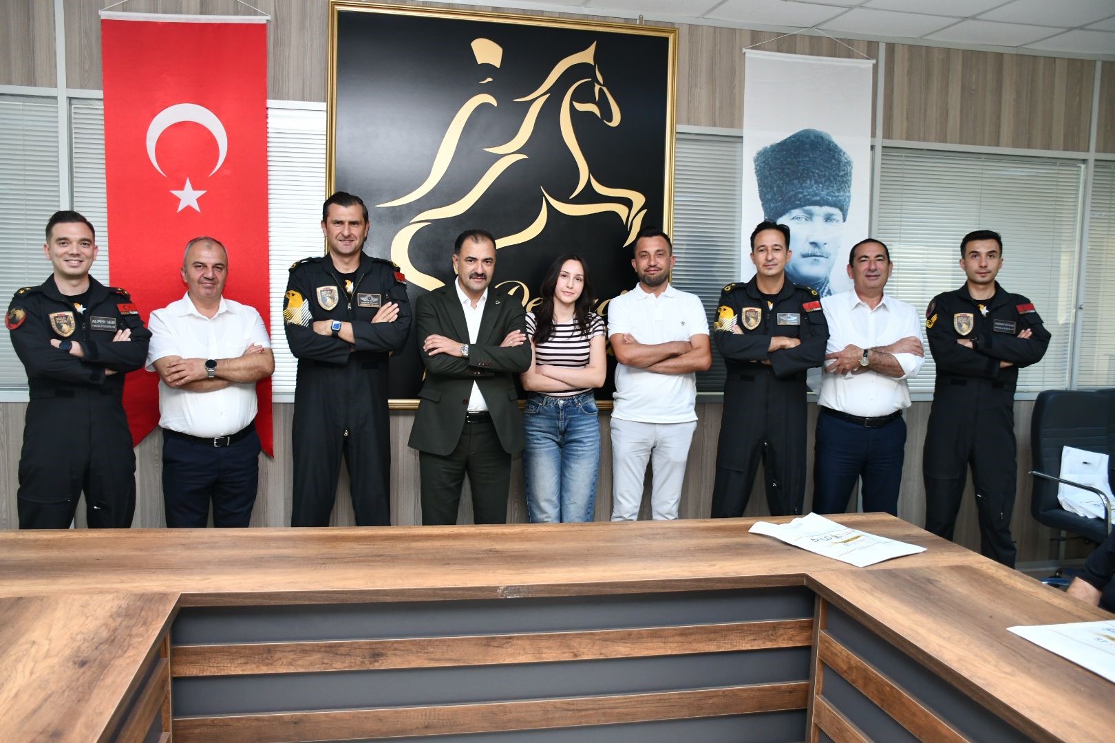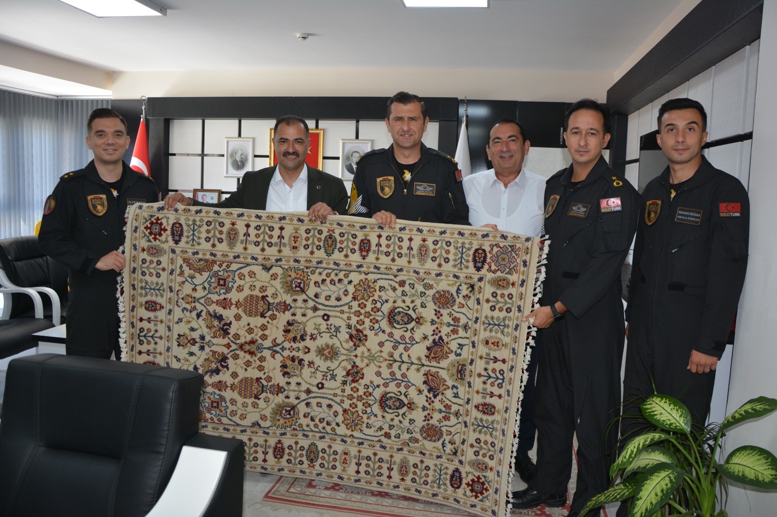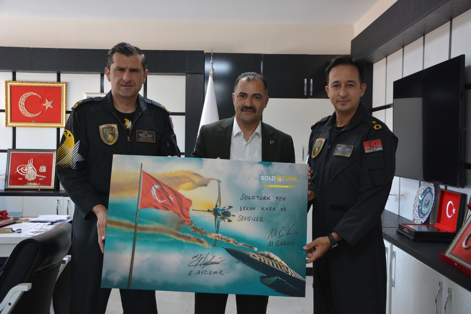 Demirci Kurtuluş Festivali dolayısıyla ilçede gösteri yapacak olan SOLOTÜRK uçuş ekibi Birinci Pilot Binbaşı Murat Bakıcı, İkinci Pilot Binbaşı M. Erhan Aydemir, Basın ve Halkla İlişkiler Subayı Üsteğmen Şükrü Alper Şen ve Basın ve Halkla İlişkiler Astsubayı Üstçavuş Muhammed Bölükbaşı Demirci Belediyesi ziyaretinde Başkan Erkan Kara ile bir araya geldi.