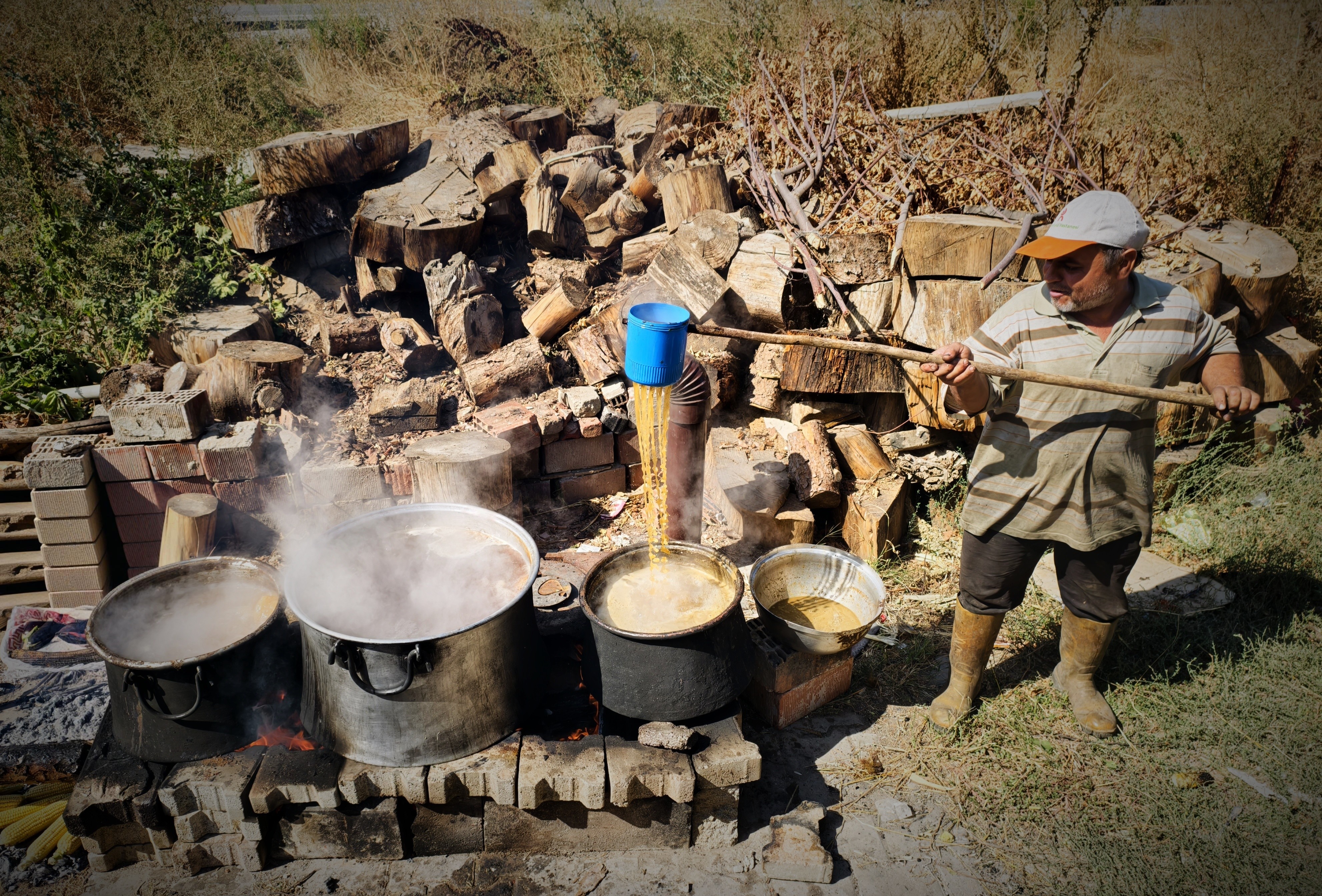 Önce çuvallar içinde ezilerek şırası çıkarılan ve pekmez toprağıyla koyulaşıncaya kadar kazanlarda kaynatılarak yapılan pekmez hem gece hem gündüz yapılıyor.
