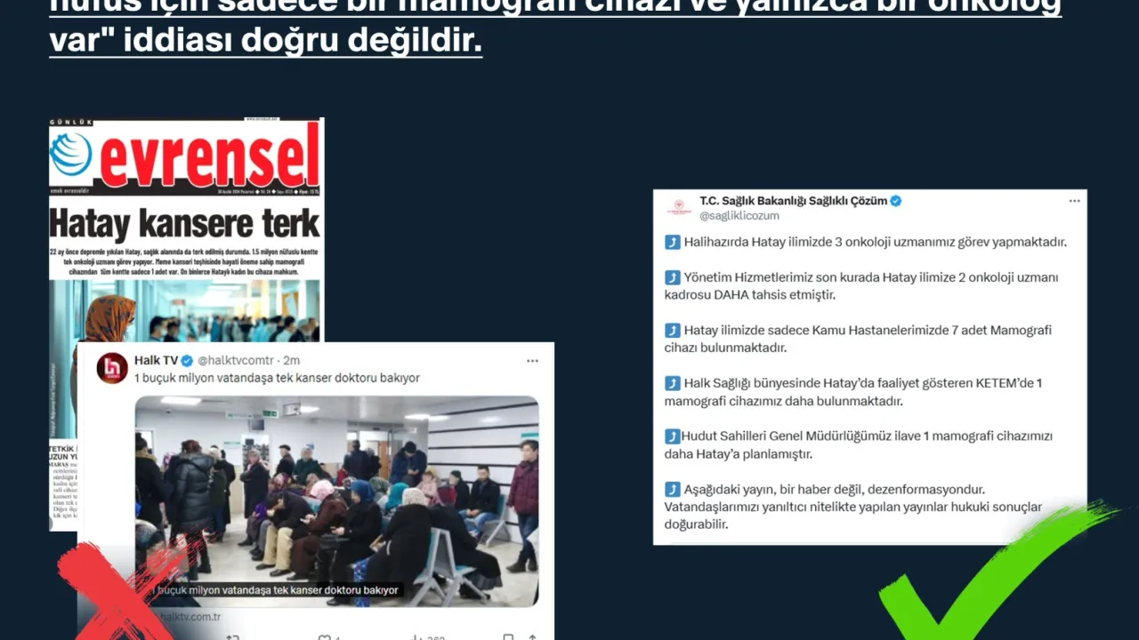 Dezenformasyonla Mücadele Merkezi, bazı basın yayın organlarında yer alan "Hatay'da 1.5 milyonluk nüfus için sadece bir mamografi cihazı ve yalnızca bir onkolog var" iddiası doğru olmadığını belirtti.