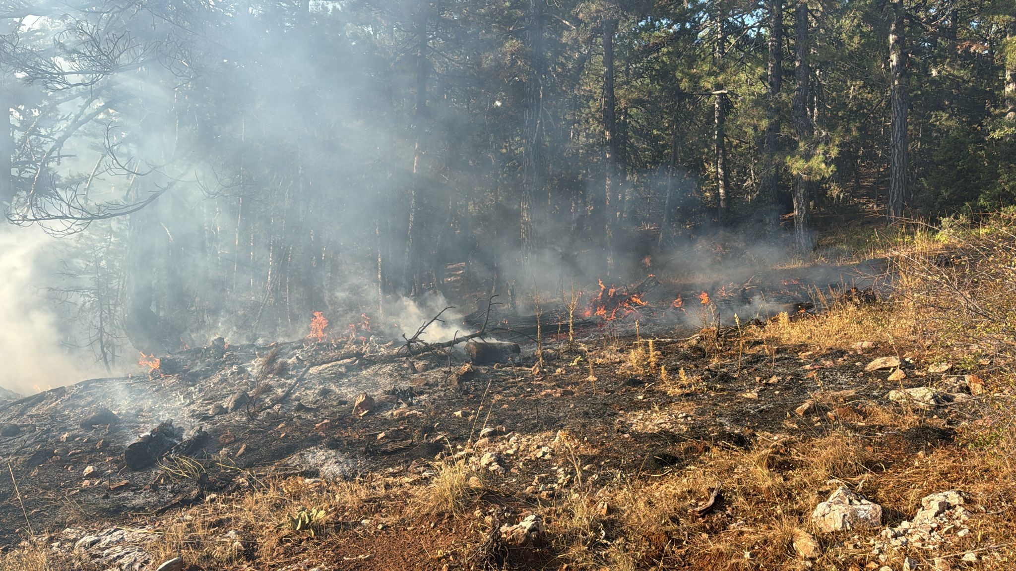 Meydana gelen yangında yaklaşık 500 metrekarelik kara çam ormanı zarar gördü.