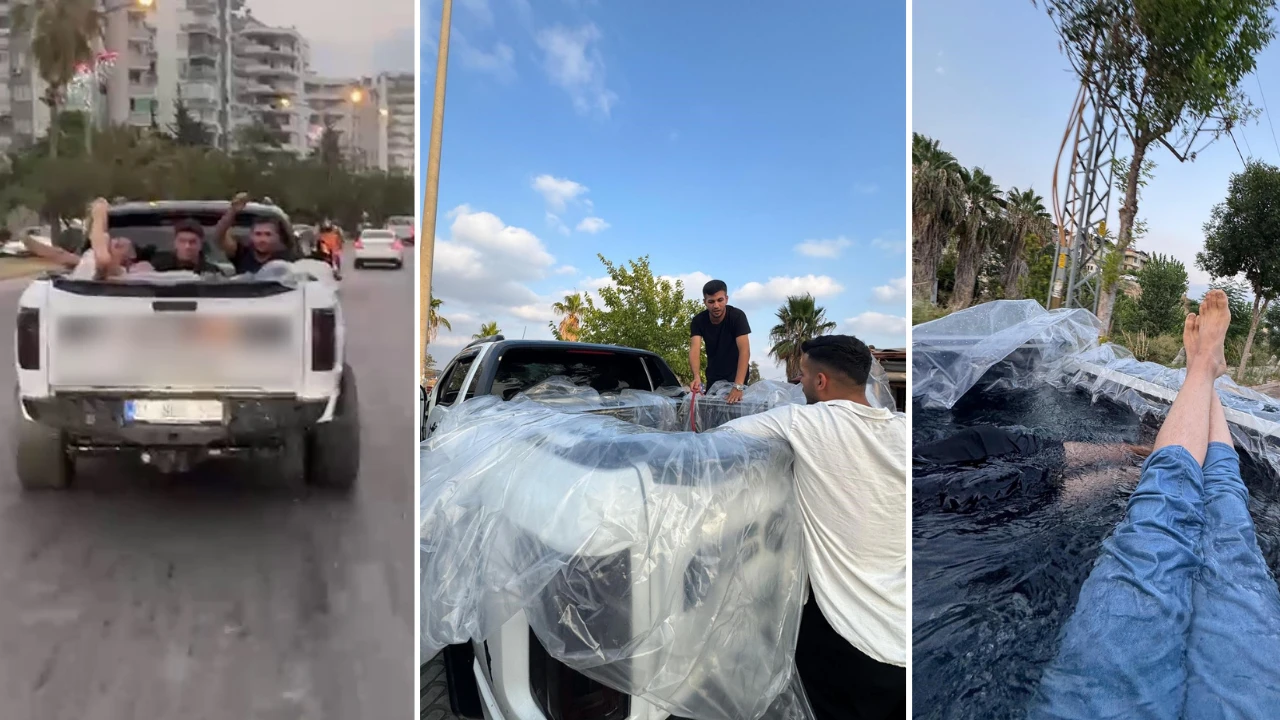Adana'da yaşayan Ömer Oğuz, geçen ay arkadaşlarıyla birlikte aşırı sıcaktan bunalınca aracın kasasını havuza çevirdi.
