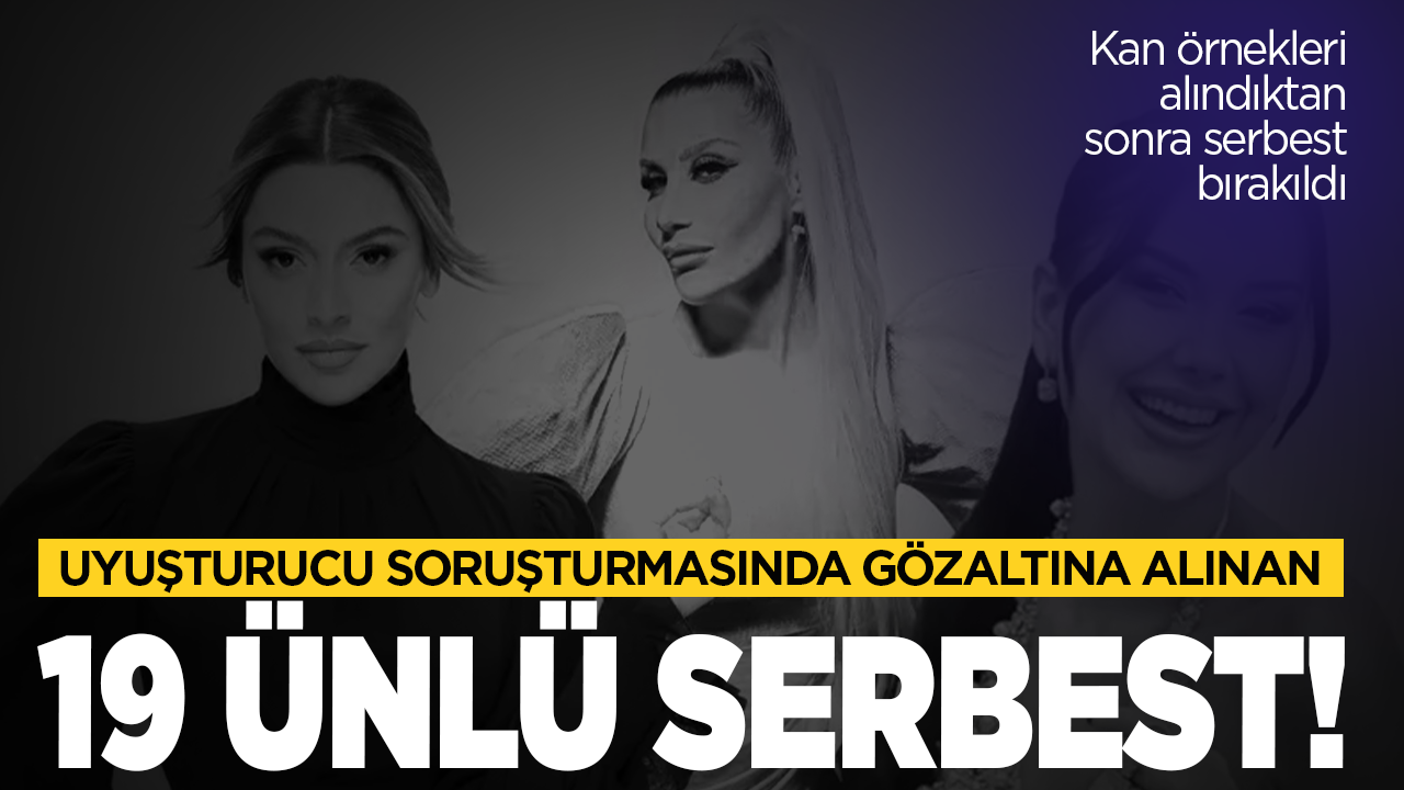 İstanbul'da, haklarında uyuşturucu madde kullanmak suçundan soruşturma başlatılan, aralarında Dilan Polat, İrem Derici, Hadise, Demet Evgar gibi ünlü isimlerin de bulunduğu 19 şüphelinin tamamı, Adli Tıp Kurumu'nda kan örnekleri alındıktan sonra serbest bırakıldı.