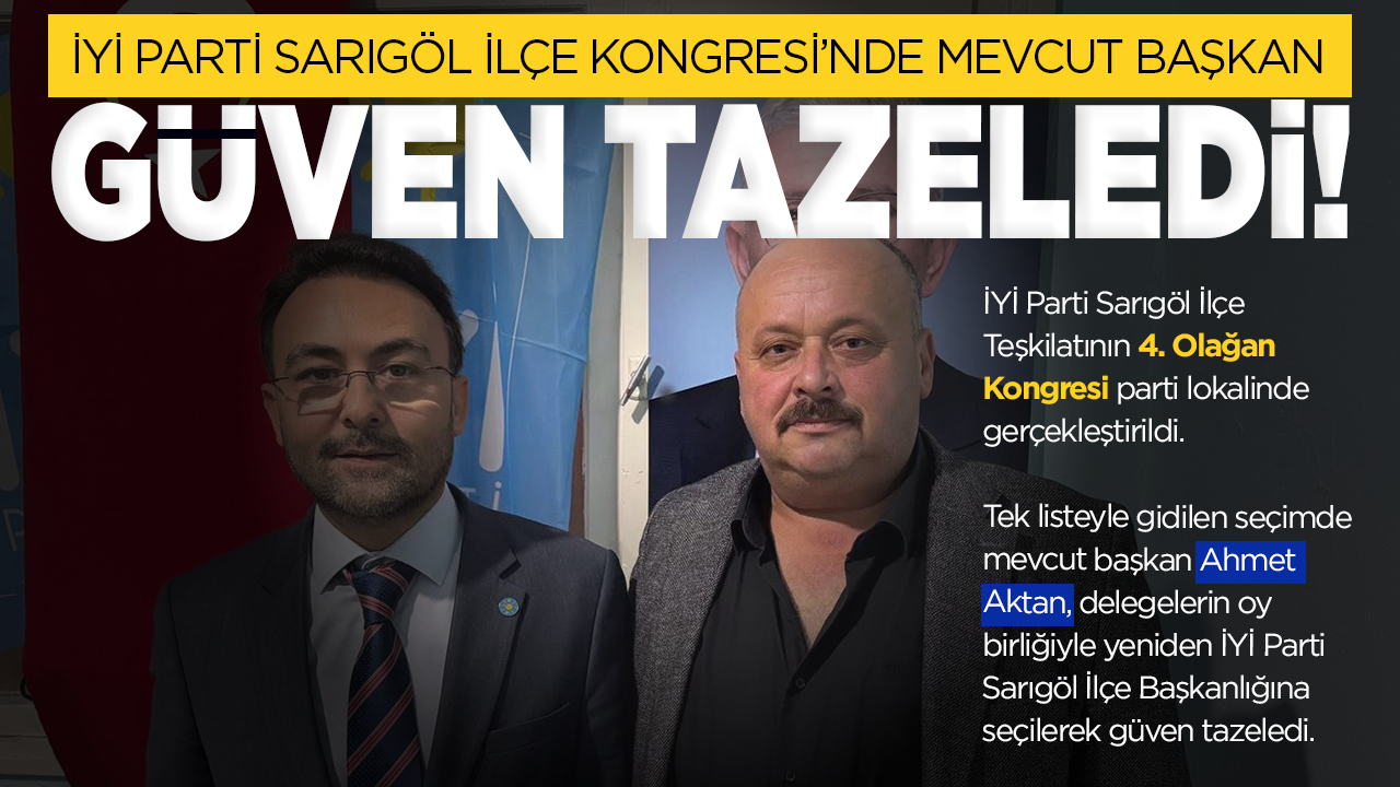 İYİ Parti Sarıgöl İlçe Teşkilatının 4. Olağan Kongresinde mevcut başkan Ahmet Aktan tek listeyle yeniden başkan seçilerek güven tazeledi.