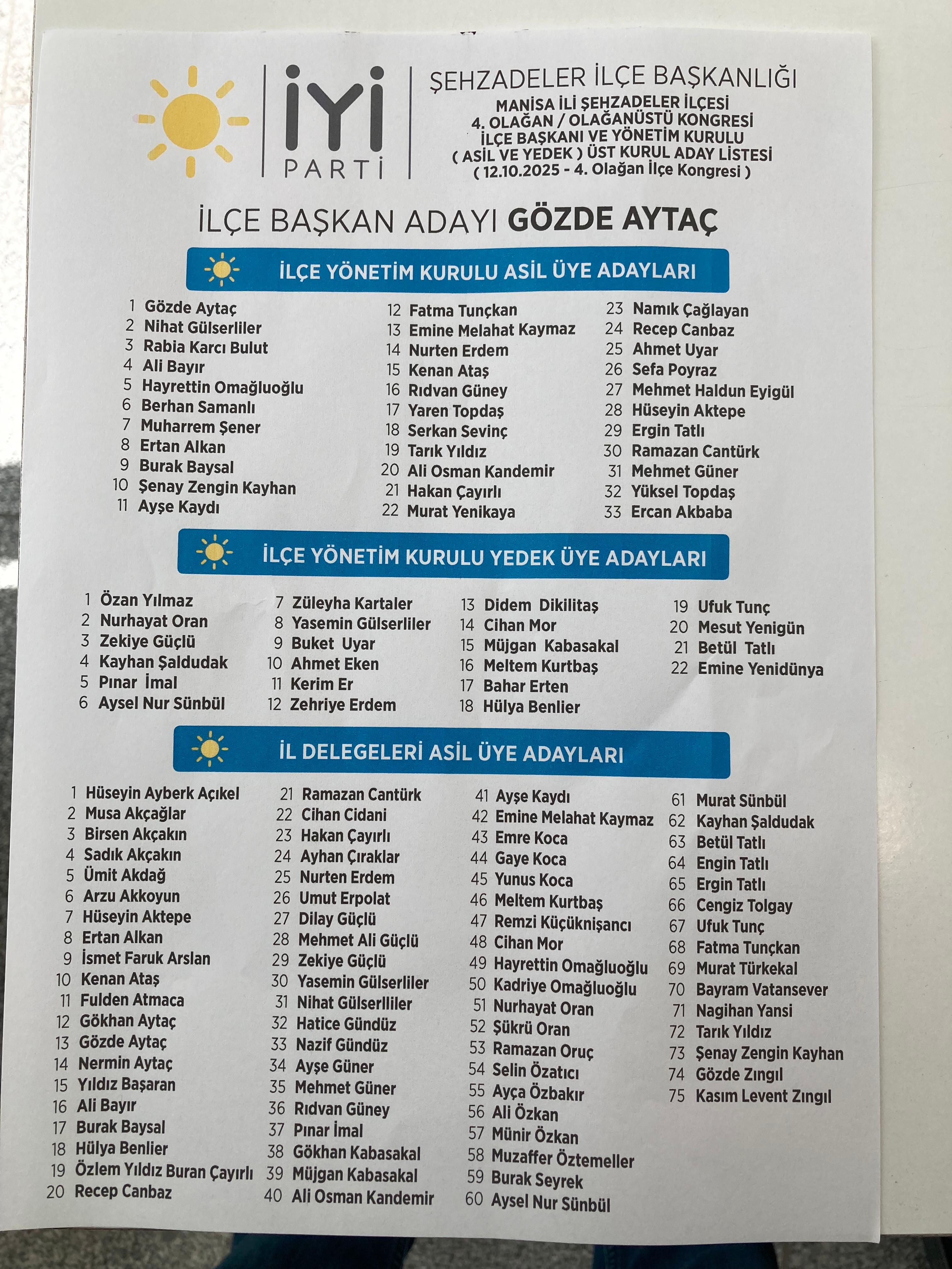 İYİ Parti Şehzadeler İlçe Başkanlığı 4. Olağan Kongresinde mevcut başkan Gözde Aytaç güven tazeledi. MASKİ İkiz Kuleler Konferans Salonunda gerçekleşen genel kurula İYİParti Genel Başkan Yardımcısı Cenk Özatıcı, GİK Üyesi Hasan Eryılmaz, İyi Parti Manisa İl Başkanı Ali Zafer İksir, CHP Şehzadeler İlçe Başkanı Mert Özkösemen, siyasi parti temsilcileri, sivil toplum kuruluşu temsilcileri ve partililer katıldı. Divan başkanlığına Genel Başkan Yardımcısı Cenk Özatıcı, divan üyeliklerine Hasan Akkurt, Tuğba Özcan ve İsmet Faruk Arslan seçildi. 1 dakikalık saygı duruşunun ardından İstiklal Marşı okundu. Halk oyunları ekibi zeybek gösterisi sergiledi. Faaliyet ve mali raporlar okunarak ibra edildi.