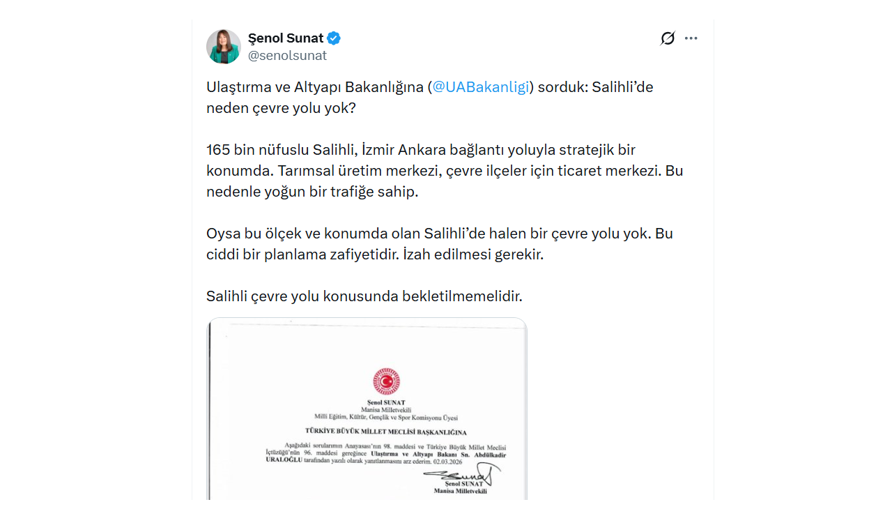 Sunat, Ulaştırma ve Altyapı Bakanlığı’na "Salihli’de neden çevre yolu yok?" sorunu yönelterek, 165 bin nüfuslu Salihli’nin İzmir-Ankara bağlantı yoluyla stratejik bir konumda olduğunu ve yoğun bir trafiğe sahip olduğunu vurguladı.
