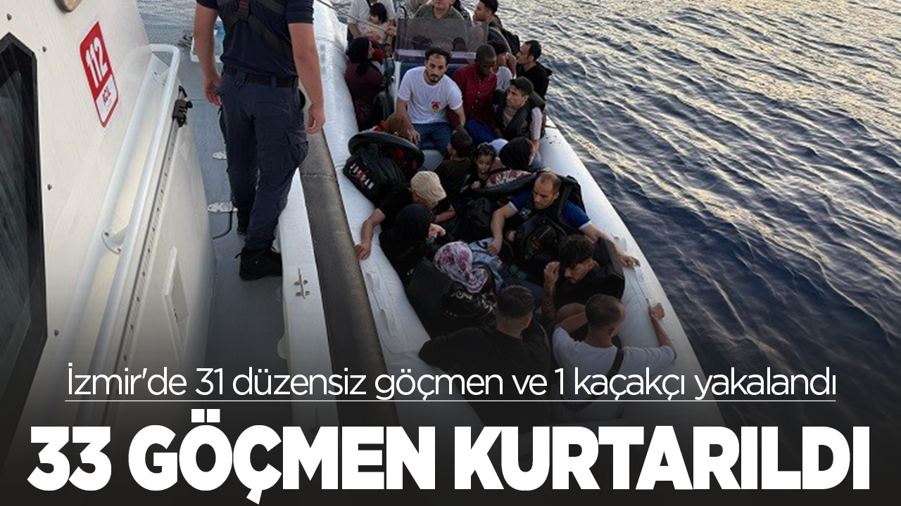 İzmir'in Menderes ilçesi açıklarında yasa dışı yollarla yurt dışına çıkmaya çalışan 31 düzensiz göçmen ile 1 organizatör yakalanırken, Dikili ilçesi açıklarında motor arızası nedeniyle sürüklenen lastik bottaki 33 göçmen kurtarıldı.