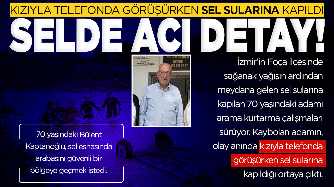 Edinilen bilgiye göre 70 yaşındaki Bülent Kaptanoğlu, sel esnasında arabasını güvenli bir bölgeye geçmek istedi. Ancak bir anda yükselen sel suları, Kaptanoğlu’nun aracını sürükledi. Kaptanoğlu’nun olay anında kızıyla telefonda konuştuğu, yardım istediği öğrenildi. Yaşlı adamın telefonu suya düşünce bağlantıları kesildiği, ardından karşı komşusuna seslenerek yardım istediği ancak ekipler yetişmeden önce aracıyla birlikte selde kaybolduğu öğrenildi.