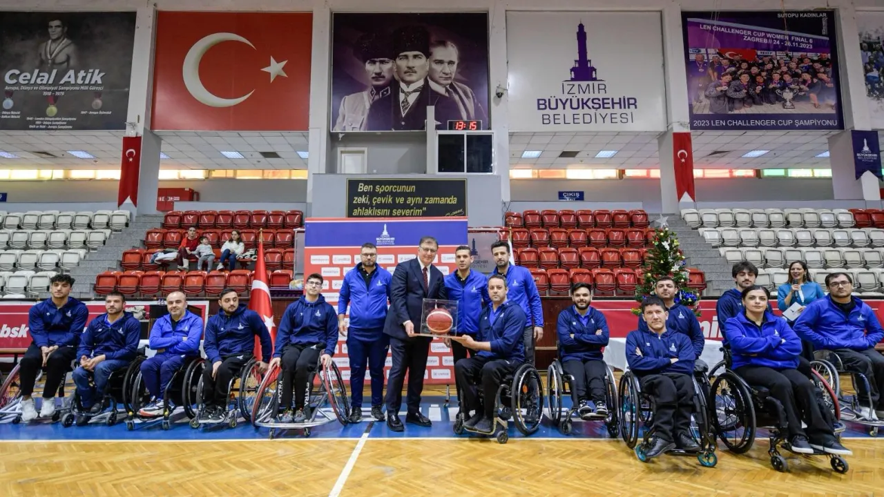 İzmir Büyükşehir Belediye Başkanı Dr. Cemil Tugay, yeni yıl etkinliği kapsamında İzmir Büyükşehir Belediyesi Spor Kulübü ile Gençlik ve Spor Hizmetleri Dairesi Başkanlığı ekibi ve sporcularıyla bir araya geldi. Büyükşehir Belediyesi’nin spora verdiği önemi hatırlatan Başkan Tugay, “2025’ten itibaren ‘Ben şampiyon olacağım, bizim takımımız şampiyon olacak, İzmir Büyükşehir Belediyesi’nin desteğine ihtiyacım var’ diyen herkesin yanında olacağız” dedi.İZMİR (İGFA) - İzmir Büyükşehir Belediye Başkanı Dr. Cemil Tugay, Kültürpark Celal Atik Spor Salonu’nda düzenlenen yeni yıl etkinliğinde İzmir Büyükşehir Belediyesi Spor Kulübü’nün yönetici, antrenör ve sporcuları ile İzmir Büyükşehir Belediyesi Gençlik ve Spor Hizmetleri Dairesi Başkanlığı’nın personel ile bir araya geldi.