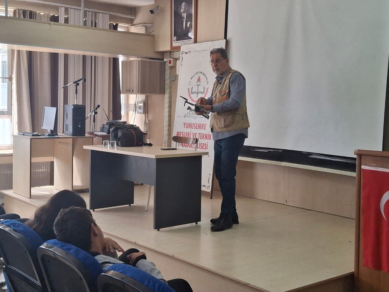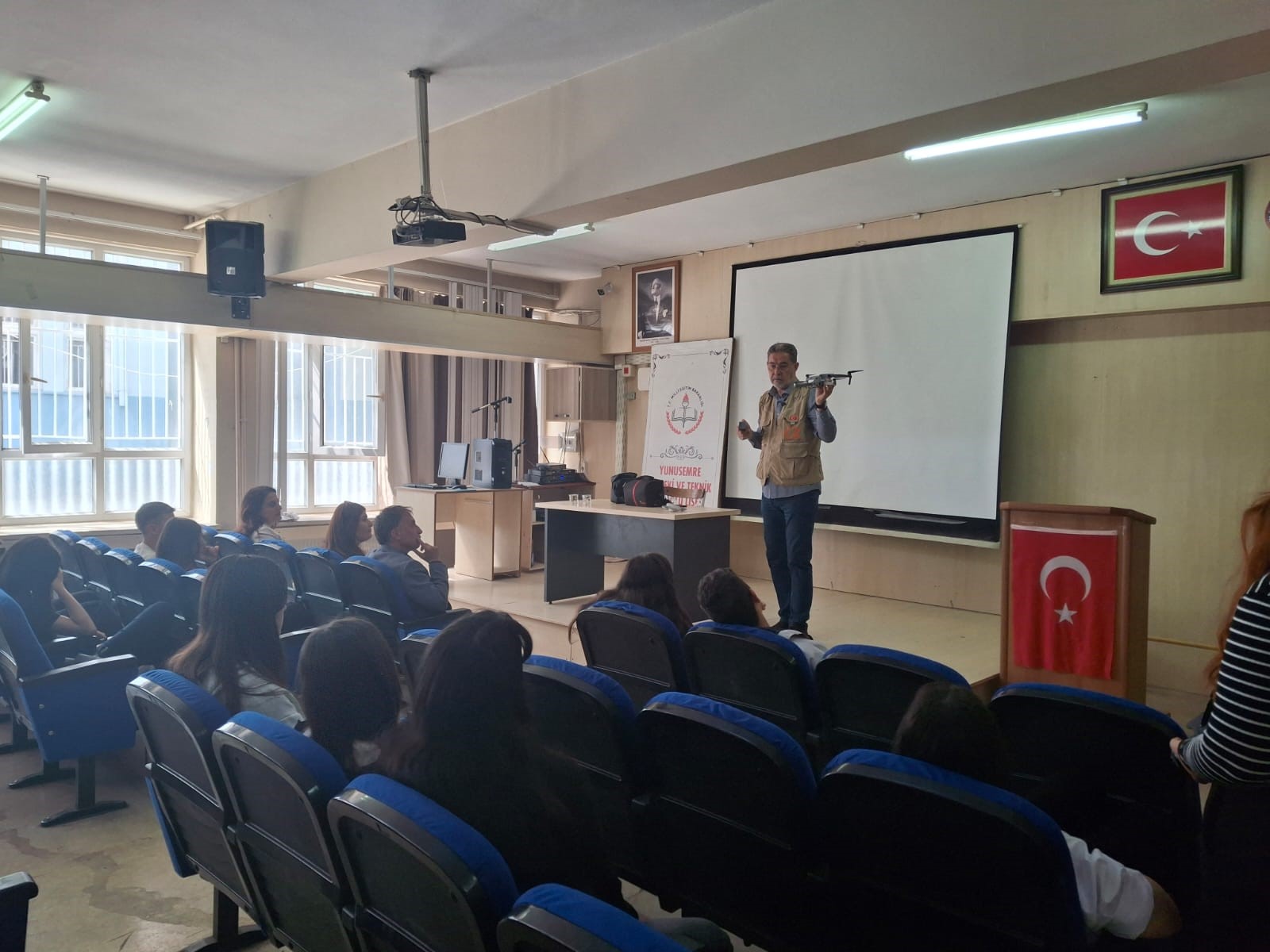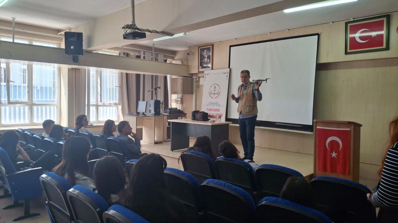 Okul Müdürü Can, "İşte bu eğitimlerden en ilgi çekici ve özgün olanı ise Drone Pilot Operatörlüğü. Bu konuda Manisa'daki en etkin isimlerden biri olan Tugay Duyar'ı öğrencileri bilgilendirmek için okulumuza davet ettik. Gazeteci ve Drone Pilot Operatörlüğü Eğitmenliği yapmış olan Turgay Duyar tarafından verilen 'Drone Pilot Operatörlüğü' öğrencilerin ilgisini çekti." diye konuştu.