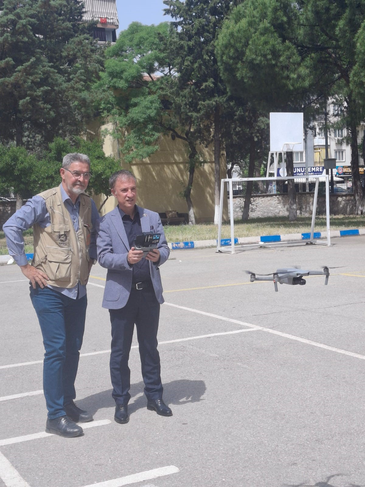 Eğitimin ardından öğrenciler ve öğretmenler okul ön bahçesinde bulunan alanda drone uçuş öncesi yapılması gerekenler hakkında uygulamalı eğitim aldı.