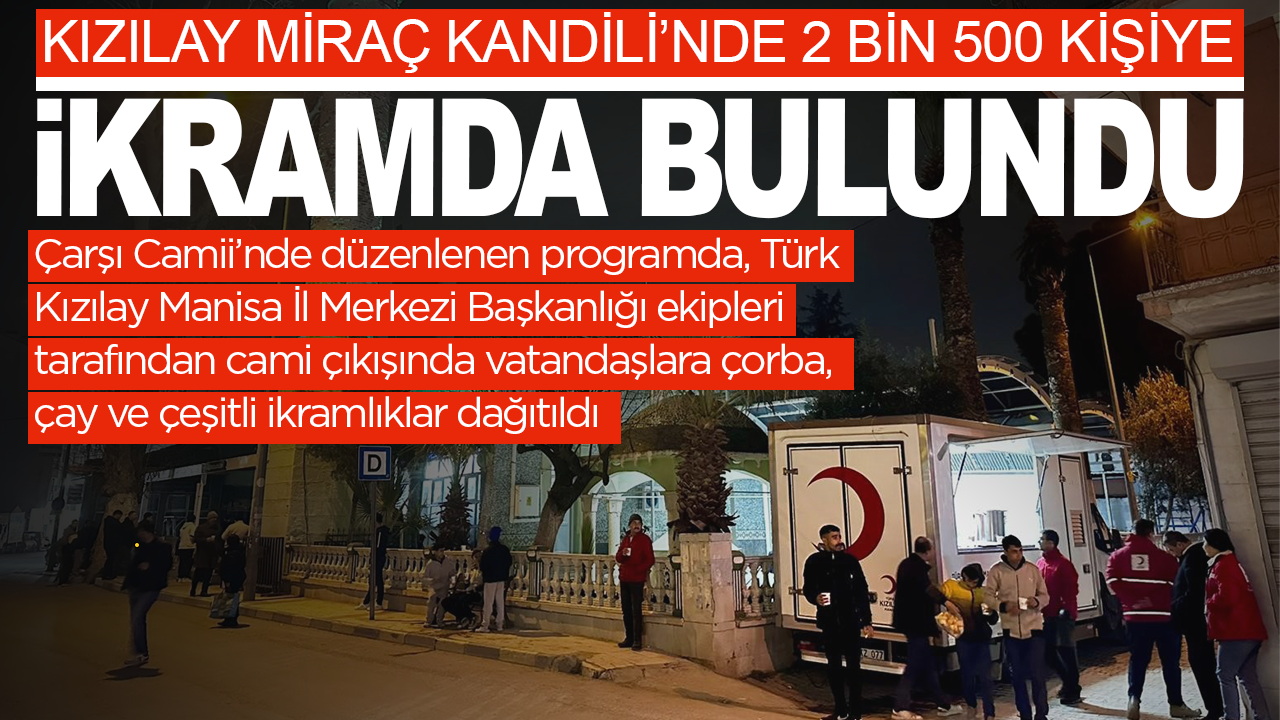 Miraç Kandili dolayısıyla Muradiye Mahallesi’nde bulunan Çarşı Camii’nde düzenlenen programda, Türk Kızılay Manisa İl Merkezi Başkanlığı ekipleri tarafından cami çıkışında vatandaşlara çorba, çay ve çeşitli ikramlıklar dağıtıldı. Programa Kızılay personelinin yanı sıra Genç Kızılay Manisa ekibi ile Kızılay gönüllüleri de destek verdi.