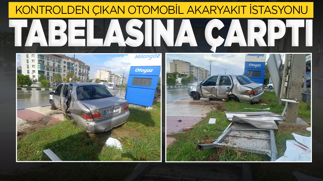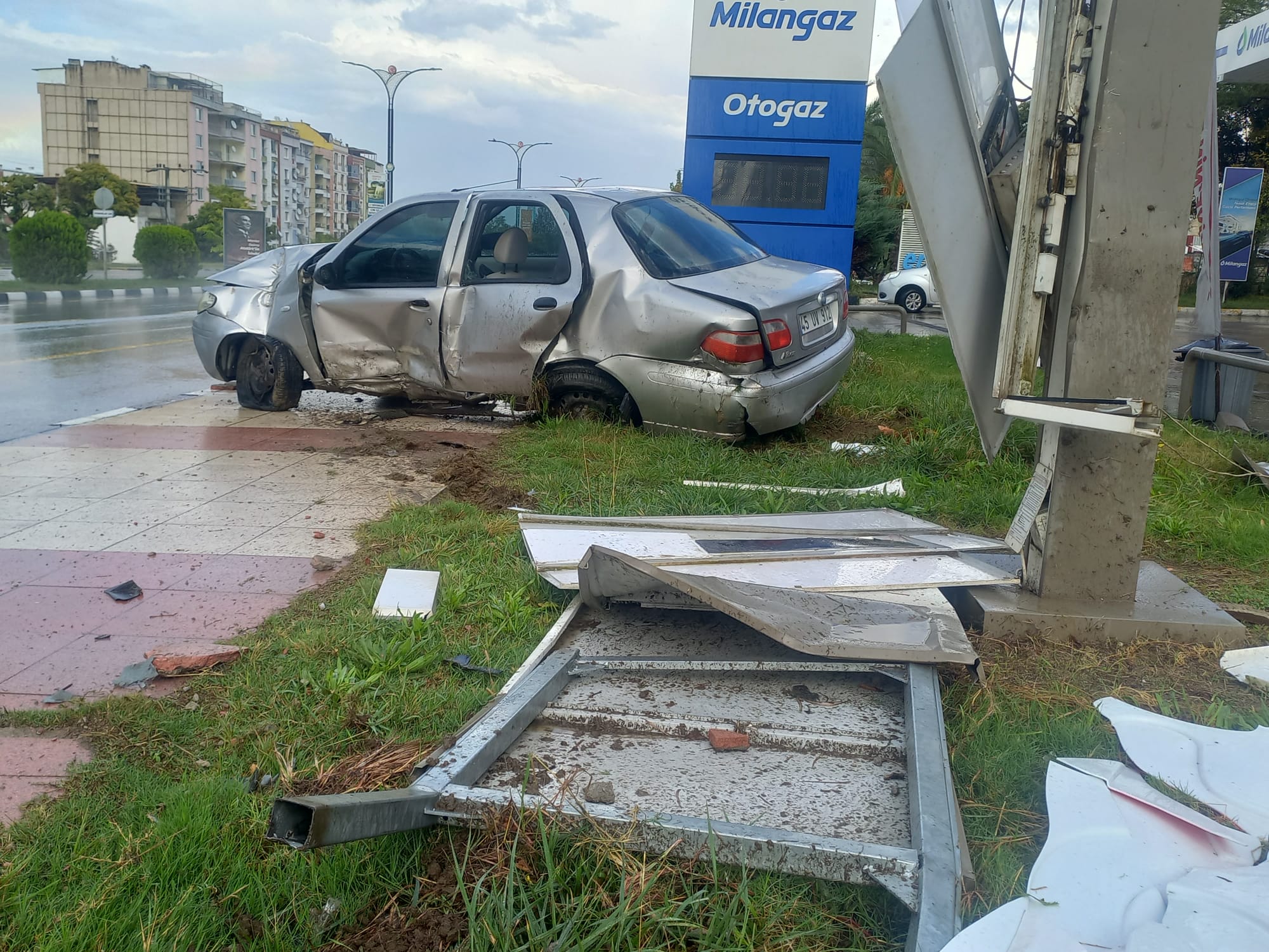 Yağış sebebiyle kayganlaşan yolda savrulmaya başlayan araç, hızla akaryakıt istasyonunun tabelasına çarptıktan sonra yan yatarak devrildi. Kazada, araç sürücüsü İ.D. ile yanında bulunan yolcu yaralandı.