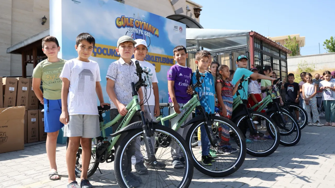 Konya Büyükşehir Belediyesi Başkan Vekili Mustafa Uzbaş, “Güle Oynaya Camiye Gel” projesi kapsamında yaz tatilinde 40 gün sabah namazına giderek bisiklet almaya hak kazanan Meram’daki çocuklara bisikletlerini hediye etti.KONYA (İGFA) - Konya Büyükşehir Belediyesi’nin “Güle Oynaya Camiye Gel” projesi kapsamında şehir merkezinde hak sahibi çocuklara bisiklet dağıtımı devam ediyor.