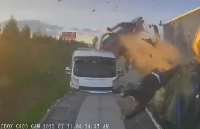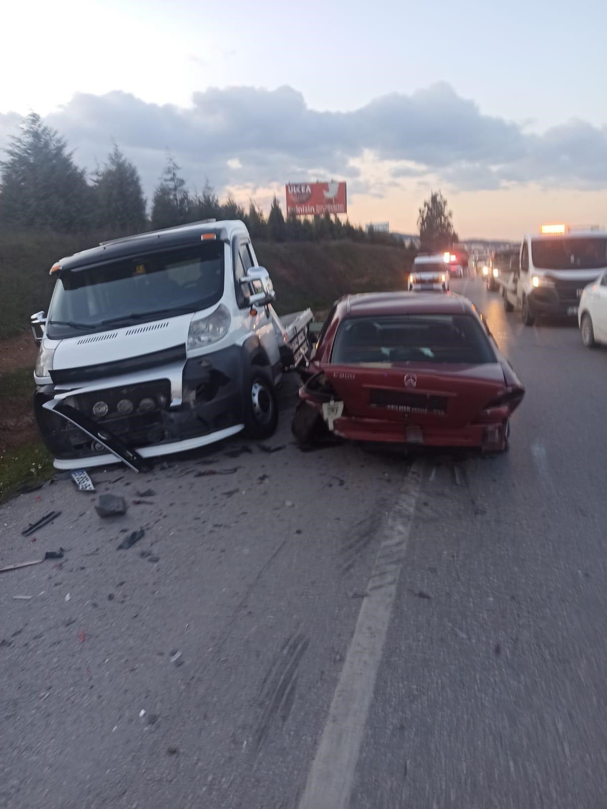 Öte yandan, kaza anı yol kenarında bulunan çekicinin araç kamerasına yansıdı. Görüntüde iki araç sürücüsünün araç kenarında bulunduğu esnada pikabın süratle araçlara çarpması, sürücülerin havaya savrulması anları yer aldı.