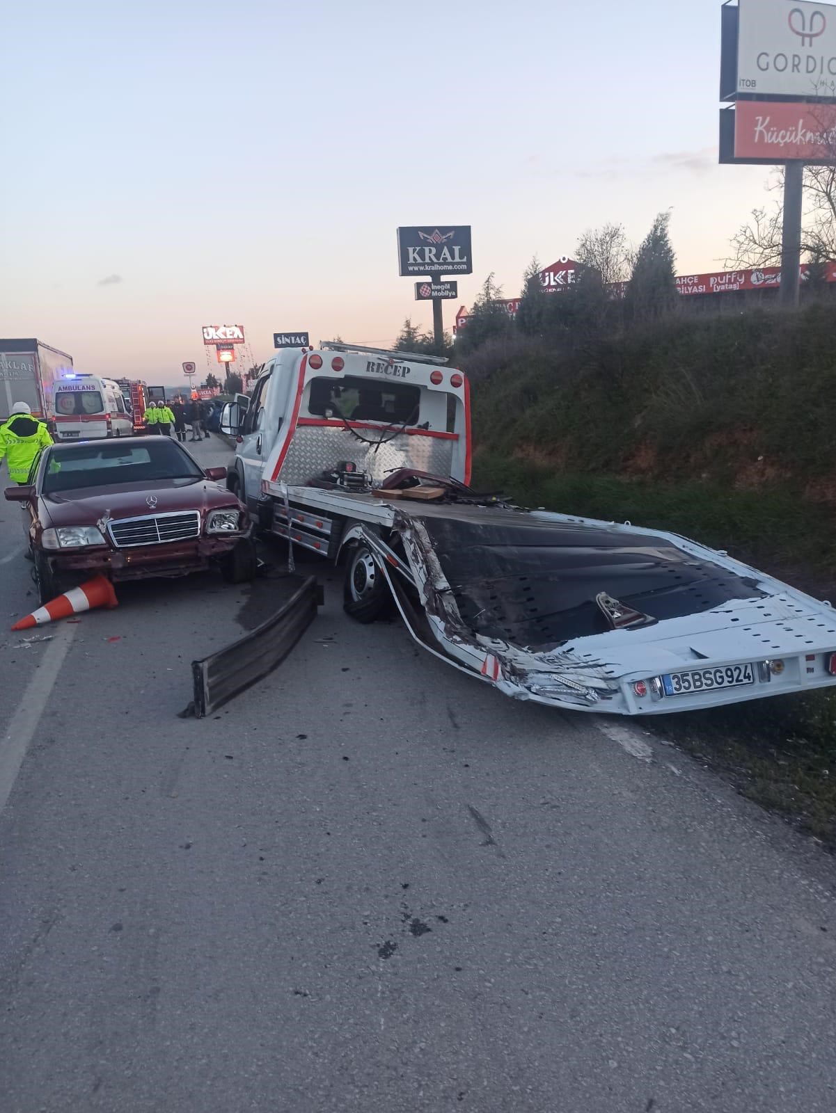 İZMİR (İHA) - Kaza, dün saat 19.00 sıralarında Süleyman Demirel Bulvarı Ayrancılar istikametinde meydana geldi. Edinilen bilgiye göre, Ahmet Toprak (38), kullandığı 35 RAY 73 plakalı çekicinin lastiğinin patlaması üzerine aracı emniyet şeridine park etti. Toprak'a yardım etmek için aynı yola giren Recep Camcı idaresindeki 35 BSG 924 plakalı çekici de bölgeye geldi. Bu esnada Muhammed S. (25) yönetimindeki 09 AOJ 265 plakalı pikap, önünde ilerleyen kamyonun sağından geçmek isterken emniyet şeridinde bulunan 2 araca çarptı. Çarpmanın şiddetiyle araç dışında olan Ahmet Toprak ve Recep Camcı havaya savruldu. Kazayı görenlerin ihbarı üzerine bölgeye polis ve sağlık ekipleri sevk edildi.