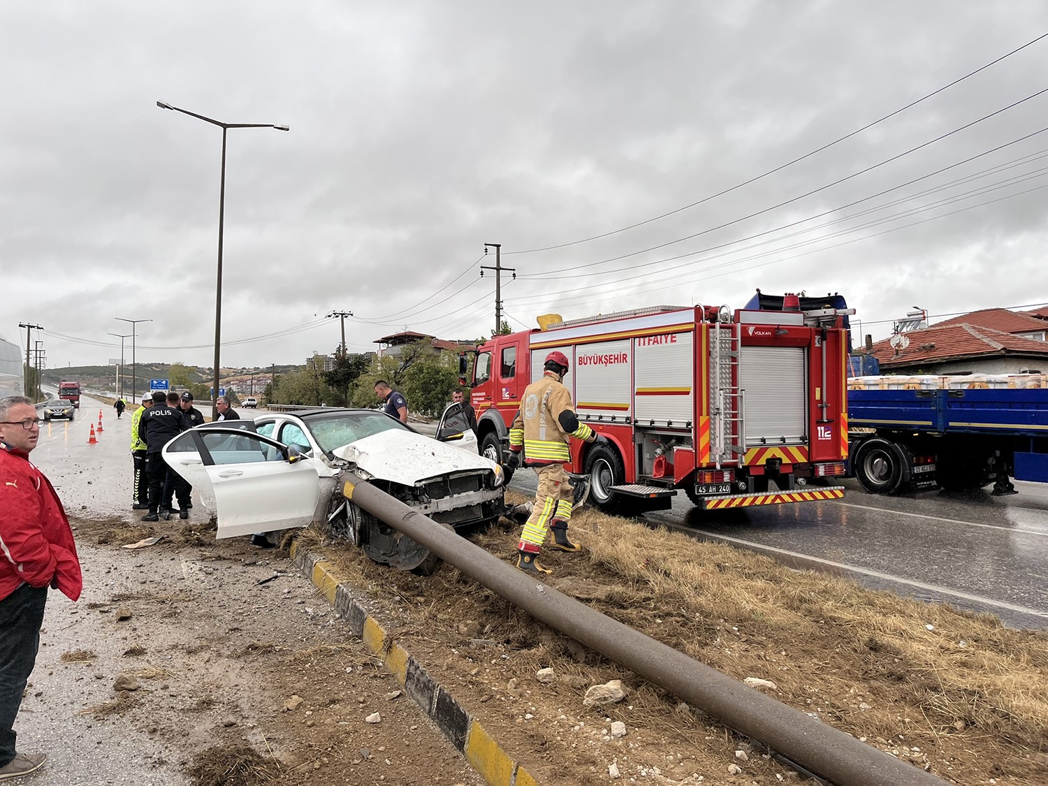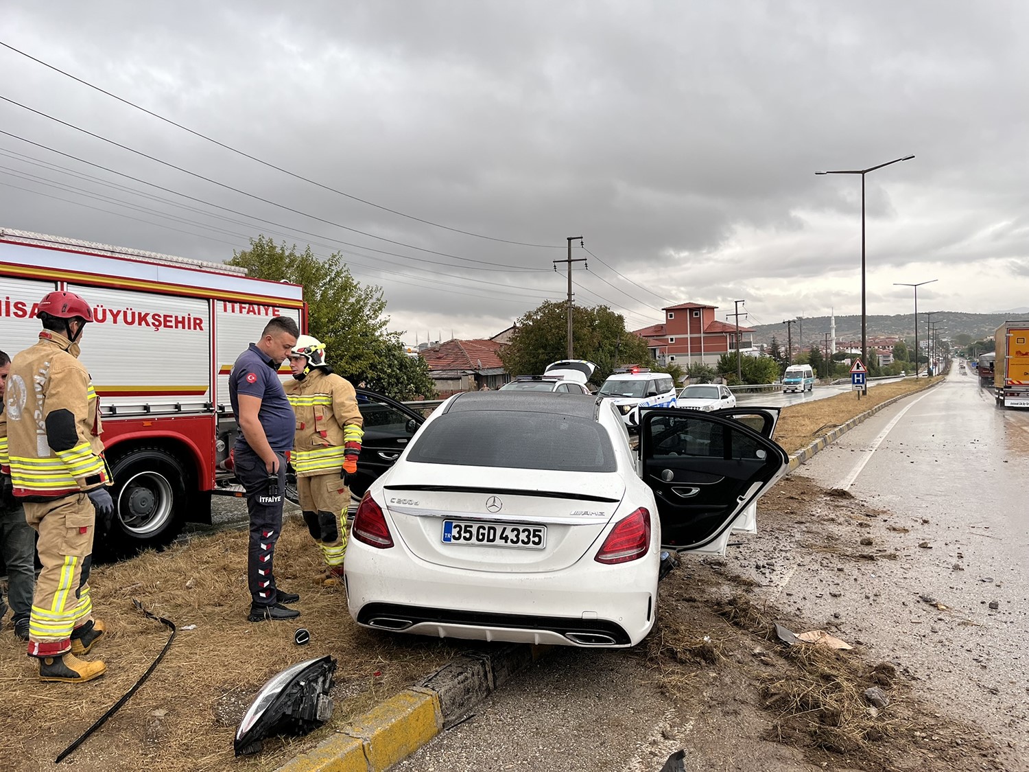 Kaza, saat 15.00 sıralarında İzmir-Ankara D300 Karayolu Kavacık rampalarında meydana geldi. Edinilen bilgiye göre, Uşak’tan İzmir istikametine seyir halinde olan S.O.D. idaresindeki 35 GD 4335 plakalı otomobil, yağış nedeniyle kayganlaşan yolda kontrolden çıkarak orta refüje çıktı. Refüjde bulunan aydınlatma direğine çarparak durabilen araçta büyük çapta maddi hasar oluştu. Otomobil sürücüsü S.O.D. ile araçta yolcu olarak bulunan 2 kişi kazayı yara almadan atlattı.