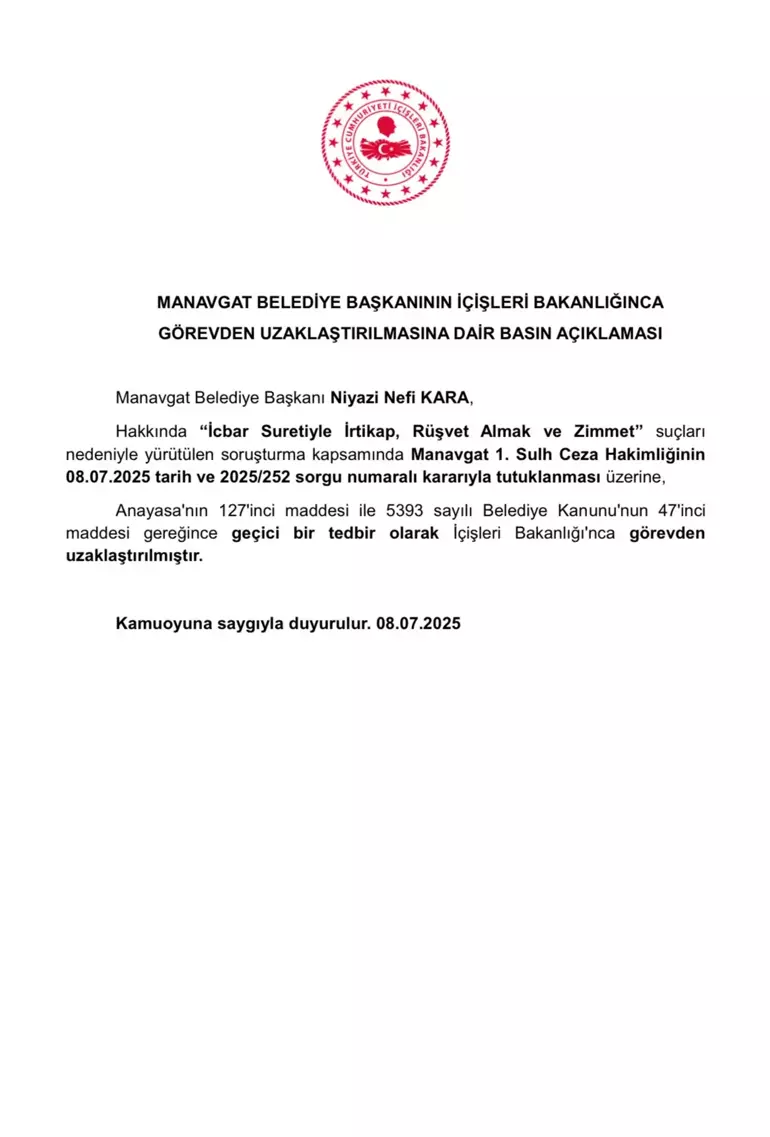İçişleri Bakanlığı duyurdu. Manavgat Belediye Başkanını Niyazi Nefi Kara görevden uzaklaştırıldı. İşte o detaylar...