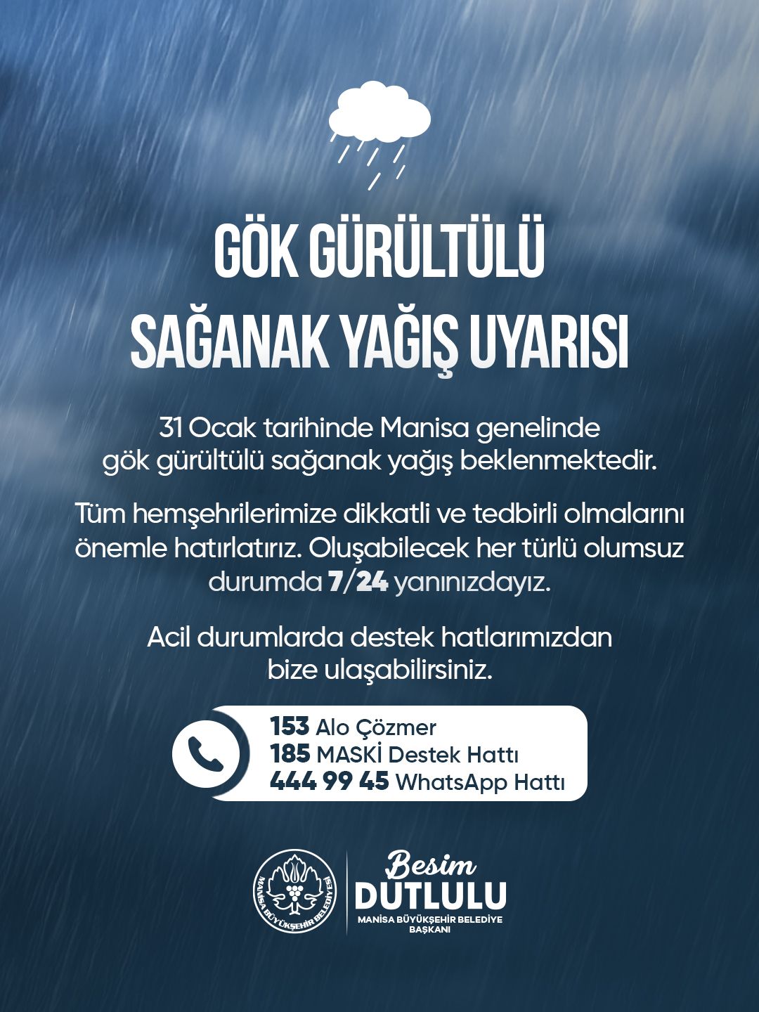 Manisa Büyükşehir Belediyesi tarafından yapılan açıklamada, 31 Ocak tarihinde Manisa genelinde gök gürültülü sağanak yağış beklendiği duyuruldu. Olası olumsuzluklara karşı vatandaşların dikkatli ve tedbirli olmaları istendi.
