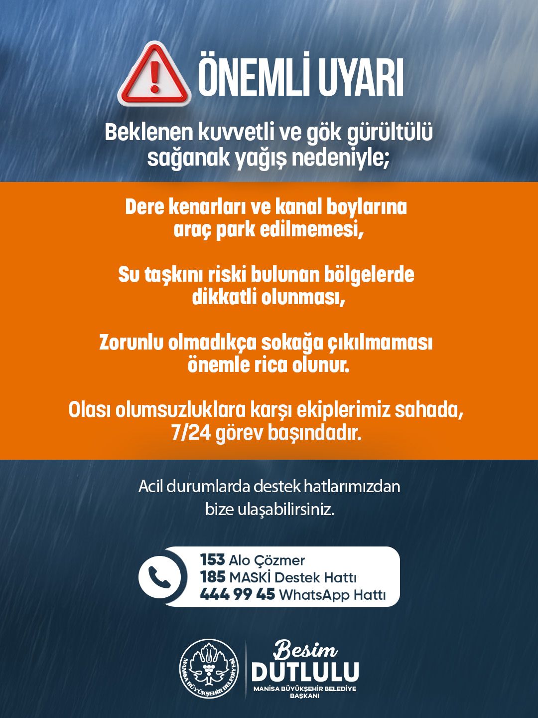 Manisa Büyükşehir Belediye Başkanı Besim Dutlulu imzasıyla paylaşılan uyarıda, vatandaşların can ve mal güvenliği açısından yapılan ikazlara hassasiyetle uymalarının önemine dikkat çekildi.