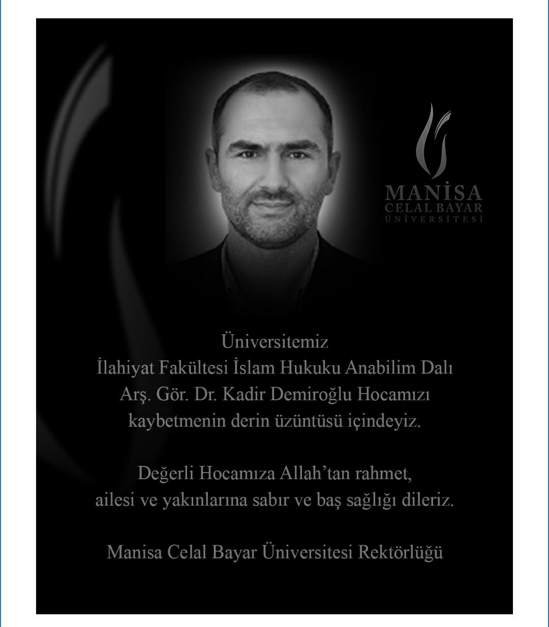 "Üniversitemiz İlahiyat Fakültesi İslam Hukuku Anabilim Dalı Arş. Gör. Dr. Kadir Demiroğlu Hocamızı kaybetmenin derin üzüntüsü içindeyiz. Değerli Hocamıza Allah'tan rahmet, ailesi ve yakınlarına sabır ve baş sağlığı dileriz. "