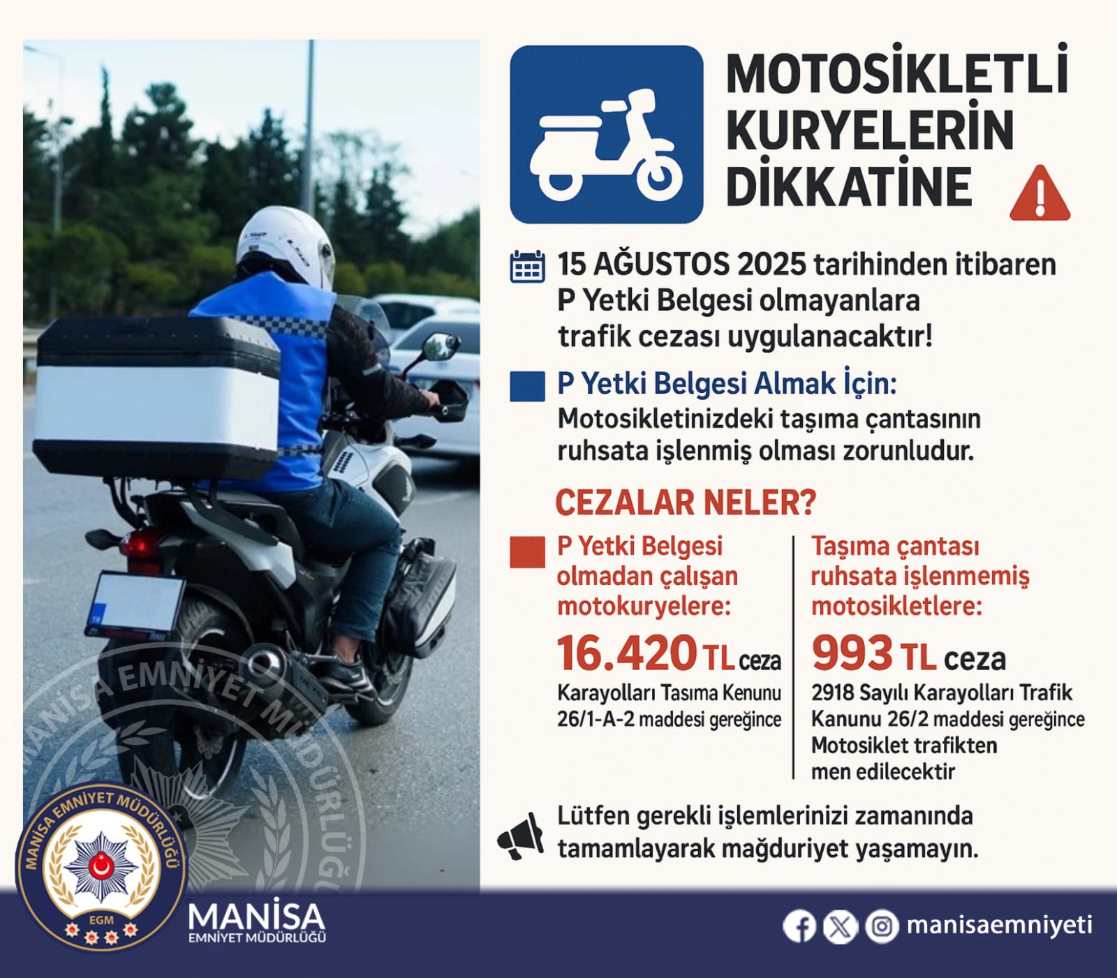 15 Ağustos 2025’ten itibaren P Yetki Belgesi olmayan motosikletli kuryelere 16 bin 420 TL, taşıma çantası ruhsata işlenmeyenlere ise 993 TL ceza ve trafikten men uygulanacak.