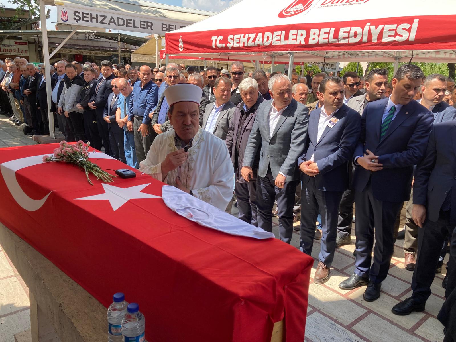 Türk Bayrağı’na sarılı olan Şen İsmet Turangil’in naaşı, Manisa Emniyet Müdürlüğü merasim mangası tarafından omuzlarda cenaze namazının kılınacağı Hatuniye Camii’ye getirildi.