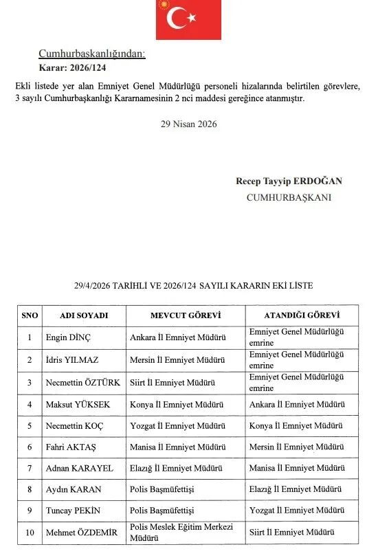 Resmi Gazete’de yayımlanan atama kararına göre Emniyet Genel Müdürü Mahmut Demirtaş görevden alındı, yerine Nevşehir Valisi Ali Fidan atandı.