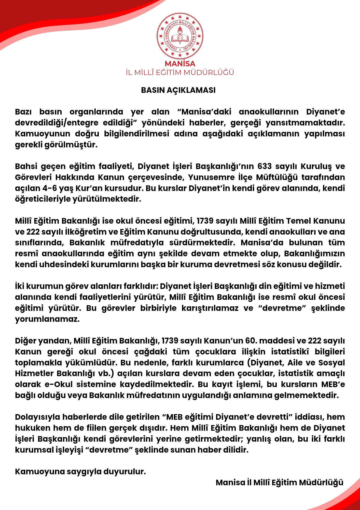 Manisa İl Milli Eğitim Müdürlüğü, bazı basın organlarında yer alan “Manisa’daki anaokullarının Diyanet’e devredildiği/entegre edildiği” yönündeki haberlerin gerçeği yansıtmadığını belirterek yazılı açıklama yaptı.