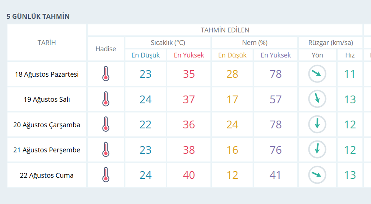 22 Ağustos Cuma günü ise termometrelerin 40 dereceyi göstermesi öngörülüyor.