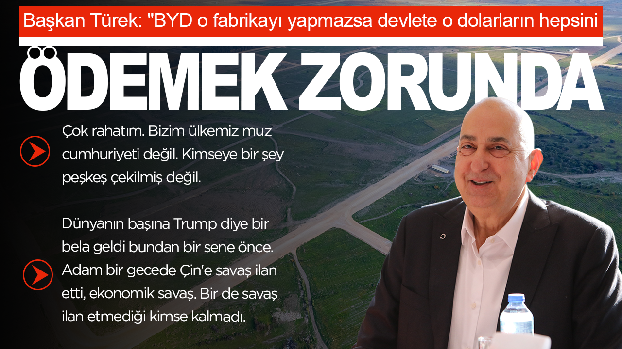 Manisa OSB Yönetim Kurulu Başkanı Sait Türek, henüz hiçbir çalışmanın başlamadığı BYD'ye ait fabrika arazisi hakkında konuştu. Fabrikanın 6 ay önce başlamış olması gerektiğini ancak dünya genelindeki yaşanan olaylar nedeniyle BYD'nin beklediğini ifade eden Başkan Türek, "Çok rahatım. Bizim ülkemiz muz cumhuriyeti değil. Kimseye bir şey peşkeş çekilmiş değil. Devletimizle de yapılan işlemleri gayet iyi biliyoruz. Bugün BYD o fabrikayı yapmazsa devlete o dolarların hepsini ödemek zorunda. 'Ben onu aldım da yedim de kazıkladım da' öyle bir şey yok. Bu işin başındaki bakanlarımız, bakan yardımcılarımız son derece iyi çalışan, vatansever insanlar. Ama şu bir gerçek evet BYD'nin bundan 6 ay önce başlaması gerekiyordu. Bu doğru. Dünyanın başına Trump diye bir bela geldi bundan bir sene önce. Adam bir gecede Çin'e savaş ilan etti, ekonomik savaş. Bir de savaş ilan etmediği kimse kalmadı. Almanya, Avrupa Birliği'ne rest çekti, NATO'ya rest çekti, Çin'e rest çekti, Rusya'ya rest çekti. Rest çekmediği yer kalmadı. Şimdi sen Çin hükümeti olsan kendi ülkenin vatandaşının veya firmasının milyar dolarlık parasını henüz ne olduğu belli olmayan sis altındaki bir dünyaya bir hareket yapmasına müsaade eder misin? Etmezsin. Ben olsam etmem. O da etmez. 'E işte canım ama Macaristan'da devam ediyorlar da.' Macaristan'da adamın zaten fabrikası var zaten daha önceden. Yanına yaptığı da bizim burada yapmayı planladığının yarısı bile değil. Ve artı bizim bu işlerden önce başlanmıştı orada. Bize geldiklerinde orası zaten yürürlükteydi" ifadelerini kullandı.