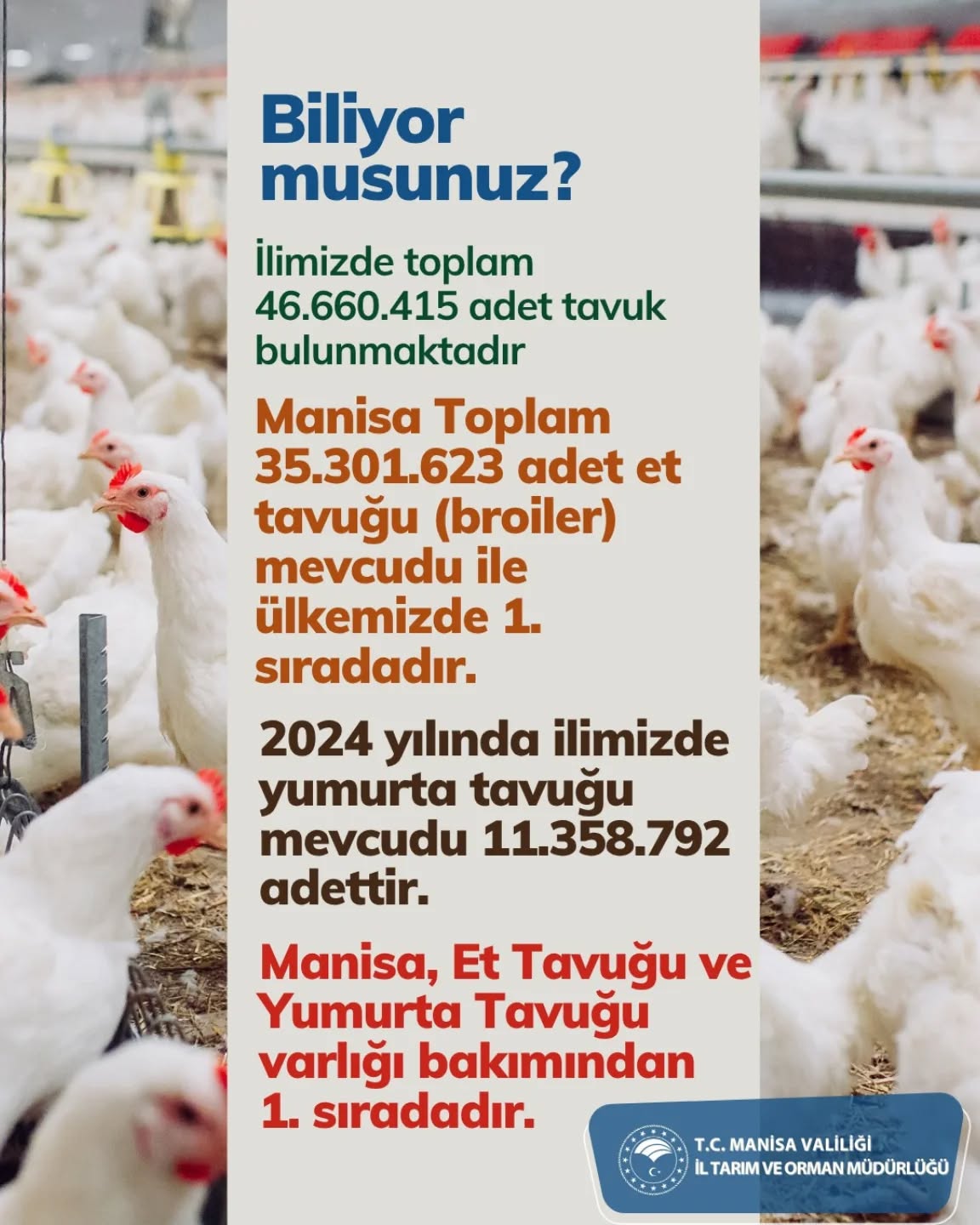 Bu veriler doğrultusunda Manisa, et tavuğu ve yumurta tavuğu varlığı bakımından Türkiye genelinde birinci sırada yer aldı.