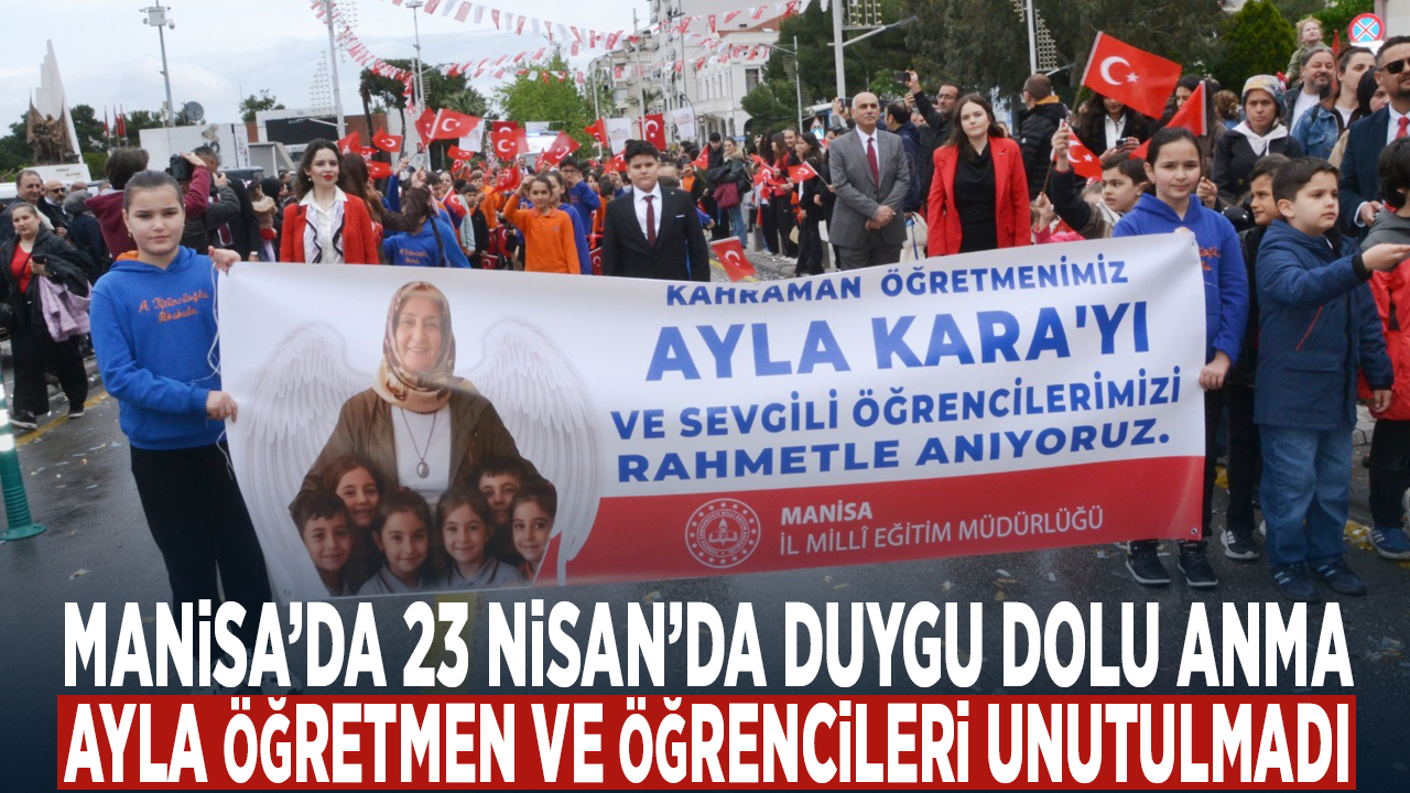 Manisa'da 23 Nisan Ulusal Egemenlik ve Çocuk Bayramı'nın 106. yıl dönümü coşkuyla kutlandı. Kutlama programı, öğrencilerin bando takımı eşliğinde Atatürk Bulvarı üzerinden Cumhuriyet Meydanı'na kadar gerçekleştirdiği kortej yürüyüşü ile başladı. Renkli görüntülerin oluştuğu yürüyüşün ardından Cumhuriyet Meydanı'nda bulunan Atatürk ve Milli Egemenlik Anıtı önünde çelenk sunma töreni gerçekleştirildi. Manisa İl Milli Eğitim Müdürü Mehmet Uğurelli ve öğrencilerin anıta çelenk sunmasının akabinde, yaşanan elim olaylarda hayatını kaybeden kahraman öğretmen Ayla Kara ve öğrenciler anısına 1 dakikalık saygı duruşunda bulunularak İstiklal Marşı okundu.