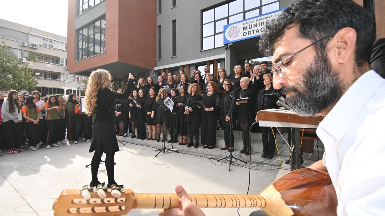 Münire Bayer Ortaokulu'nda Öğretmenler Günü kapsamında düzenlenen programda öğretmenlerden oluşan 50 kişilik koro sahne aldı. Manisa sanatçıları Erdem Yılmaz ve Turgay Yılmaz eşliğinde öğretmenlerin seslendirdiği şarkılar, izleyenlerden büyük alkış topladı ve etkinliğe renk kattı. Okul Müdürü Fevzi Yıldız, etkinliğin büyük bir emekle hazırlandığını belirterek, "Güzel bir etkinlik oldu. Bu tür çalışmalar okulda aidiyet duygusunu güçlendiriyor, hem öğrenciler hem de öğretmenler için unutulmaz anlar oluşturuyor" dedi. Program, öğrencilerin öğretmenlerine yönelik sürprizleri ve teşekkürleriyle son buldu