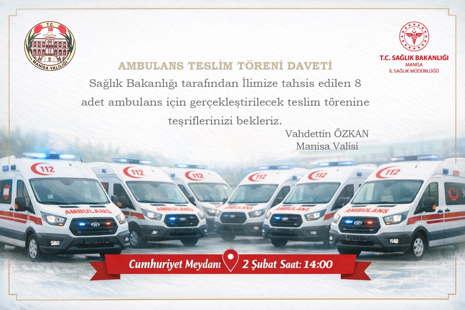 Açıklamada, teslim töreninin 2 Şubat tarihinde saat 14.00’te, Cumhuriyet Meydanı’nda yapılacağı kaydedildi. Törenin, Sağlık Bakanlığı ile Manisa İl Sağlık Müdürlüğü koordinasyonunda gerçekleştirileceği belirtildi.