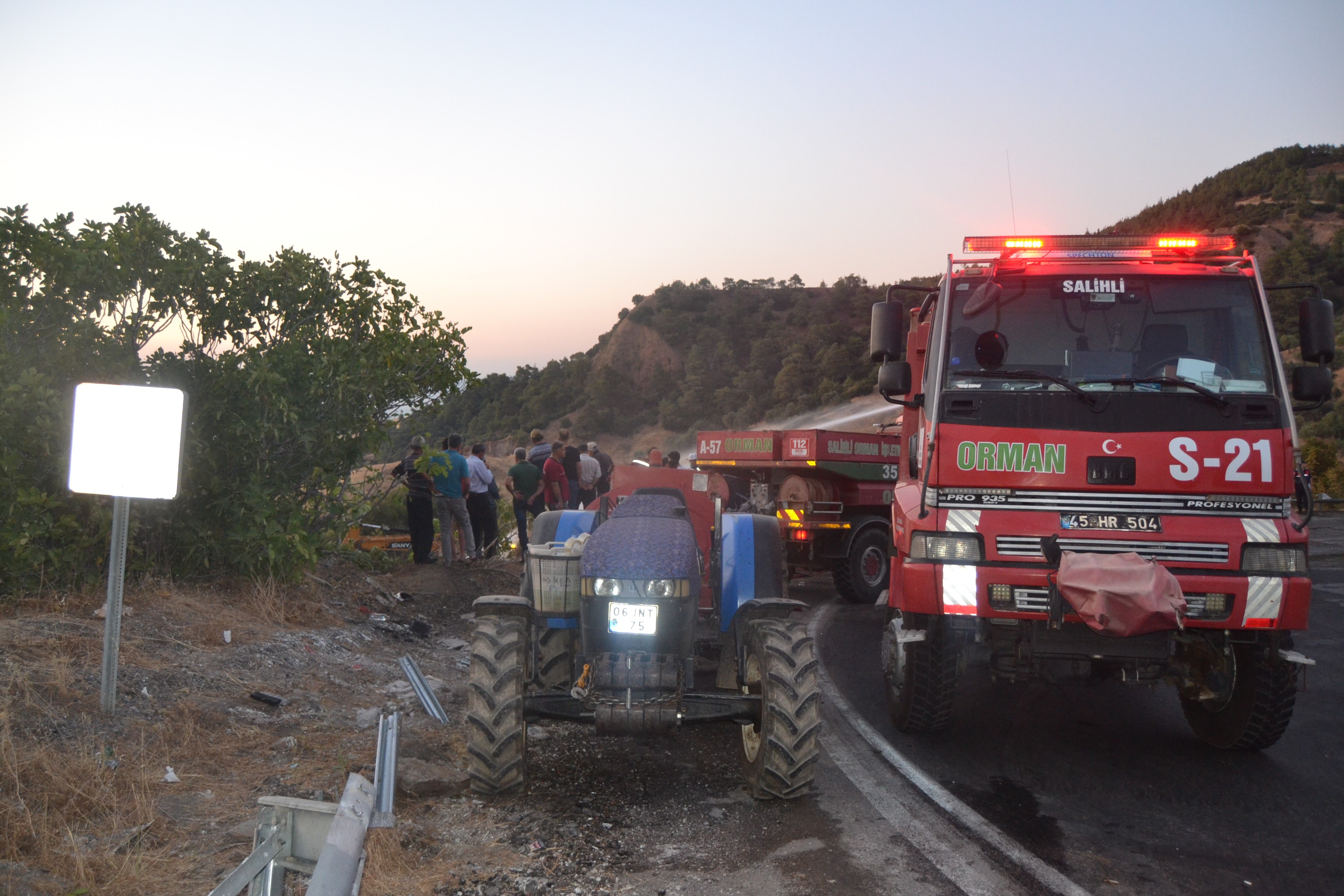 Kaza, Ödemiş-Salihli karayolu Gökköy Mahallesi Hacıoğlu mevkiinde meydana geldi. Alınan bilgiye göre, Mehmet A. yönetimindeki 64 ACD 079 plakalı plastik atık yüklü kamyon, Salihli istikametine gideuken yoldan çıkarak şarampole yuvarlandı. Kaza sonucu alev alan kamyon bir anda yanmaya başladı. Yangına ilk müdahaleyi bölgede bulunan mahalle sakinleri su tankerleri ile yaptı. İhbar üzerine olay yerine gelen Orman İşletme Müdürlüğü’ne bağlı ekipler ve Salihli İtfaiye Amirliği’ne bağlı ekipler, yangını ormana sıçramadan söndürdü. Yangın nedeniyle Salihli-Ödemiş karayolu bir süre süre trafiğe kapatıldı. Salihli Devlet Hastanesine kaldırılan yaralı sürücünün ise tedavisinin sürdüğü öğrenildi.