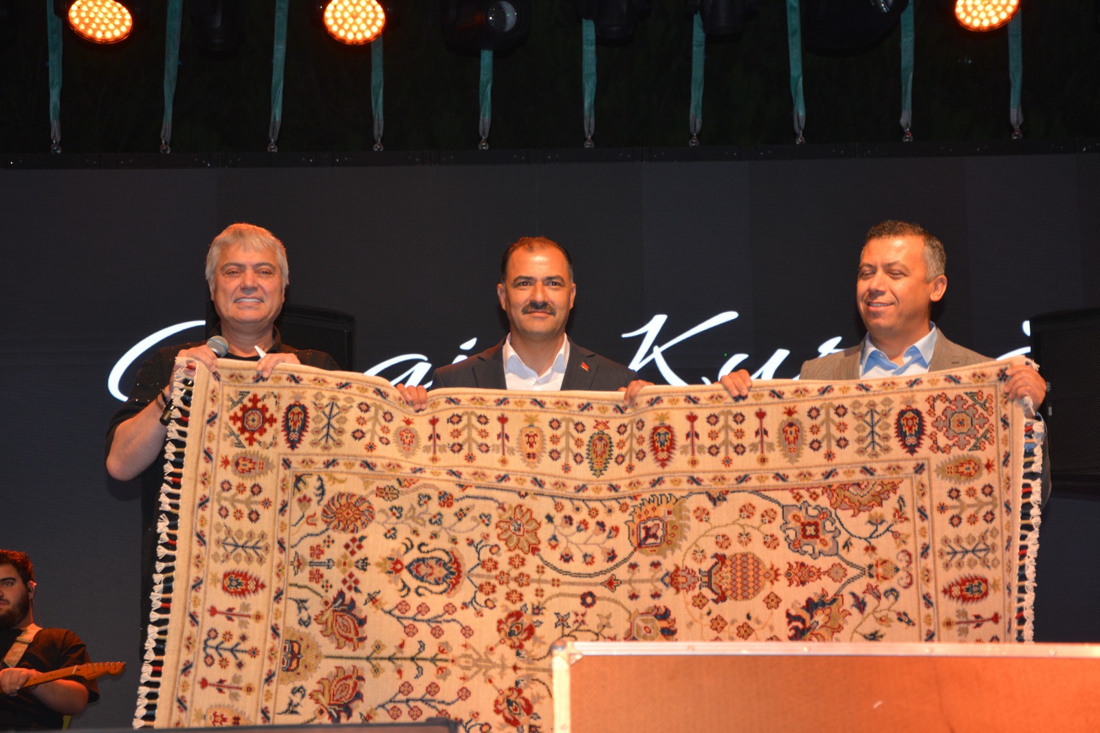 Konser sonrası Kaymakam Bayram ve Başkan Kara sanatçıya Cengiz Kurtoğlu'na, yöresel el dokuma halı ve çiçek takdim etti.