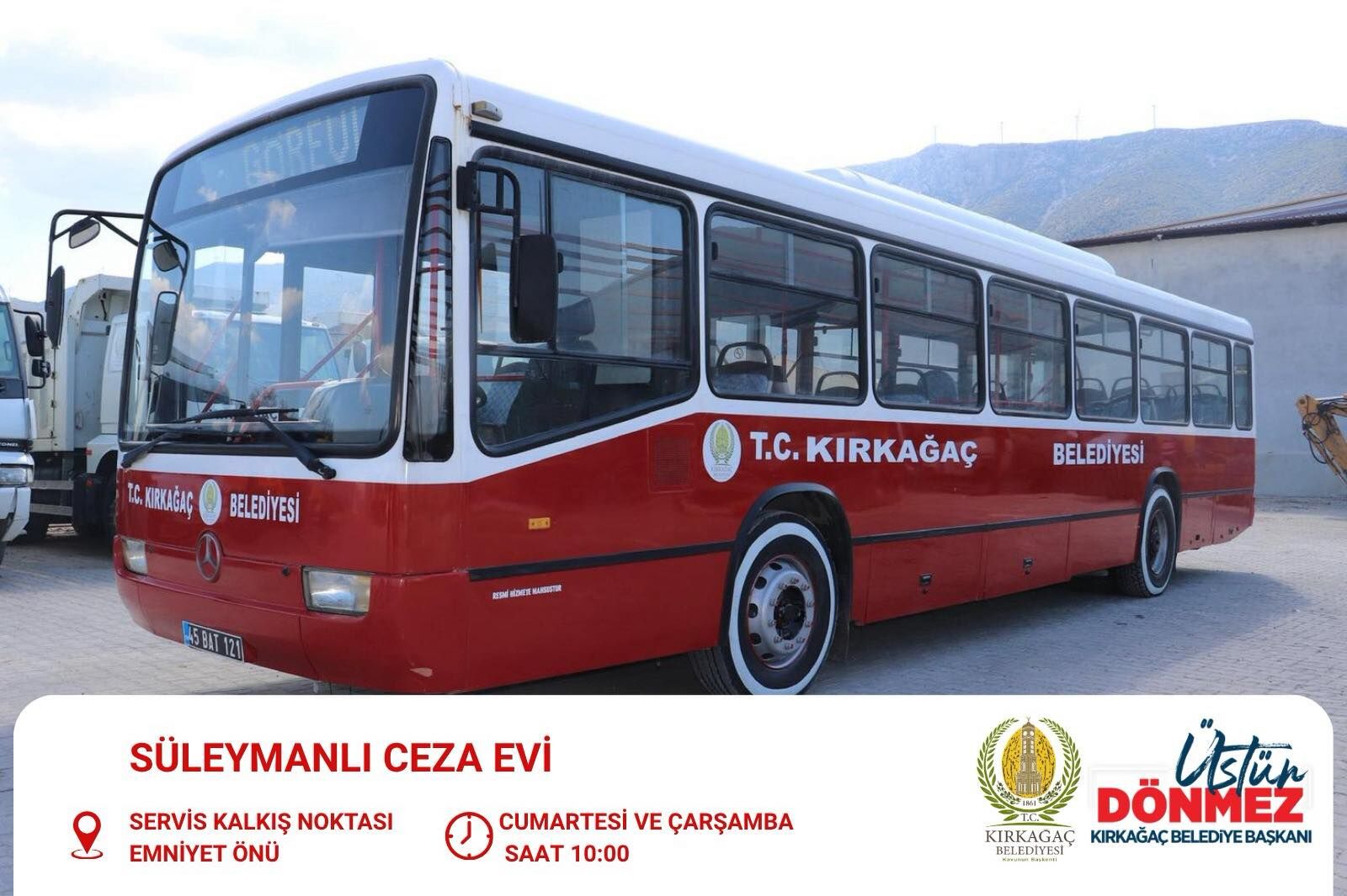 Kırkağaç Belediye Başkanı Üstün Dönmez, cezaevinde yakını bulunan ve ulaşımda zorluk yaşayan vatandaşlar için ücretsiz servis hizmetinin başlatılacağını duyurdu.