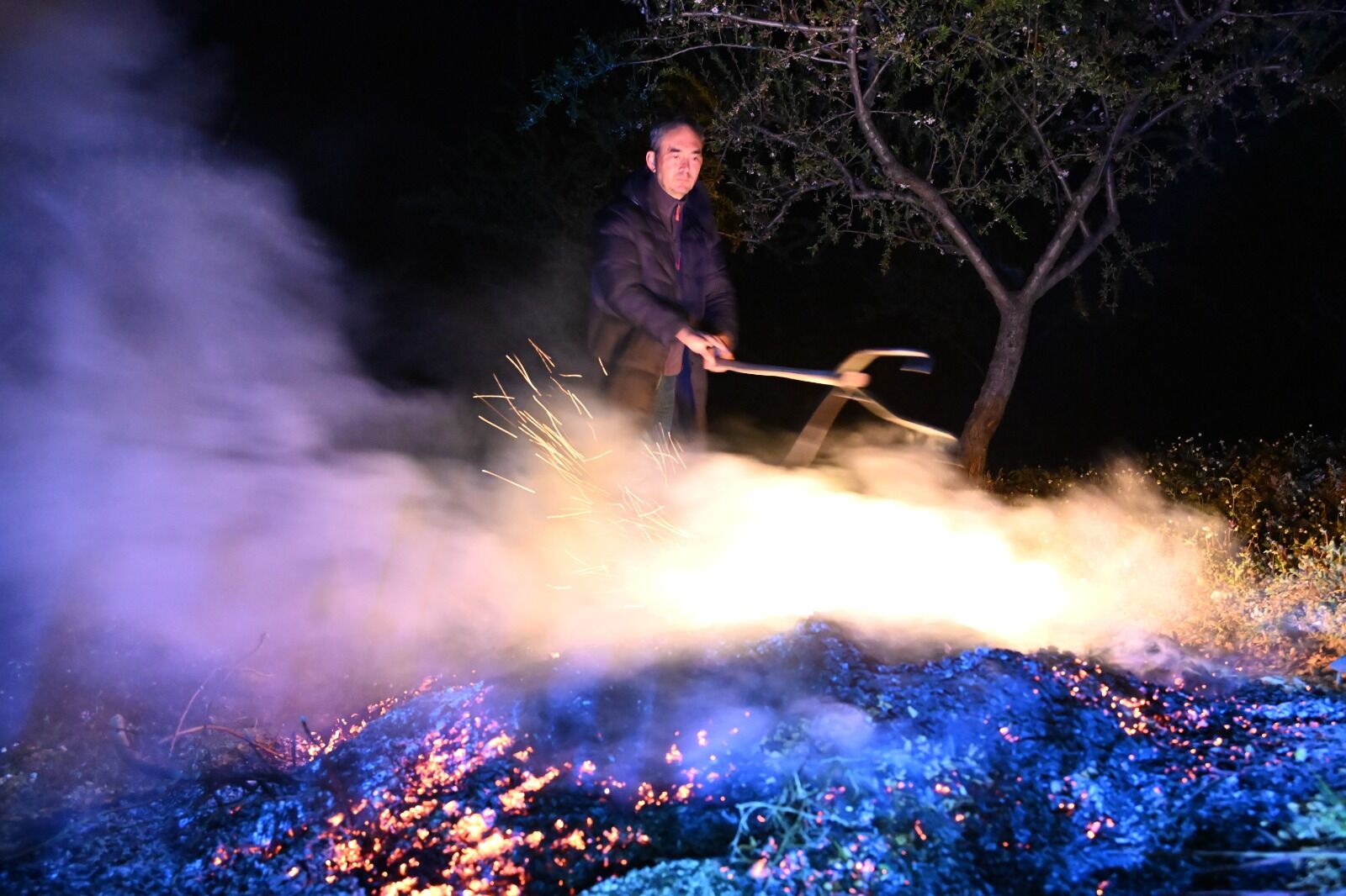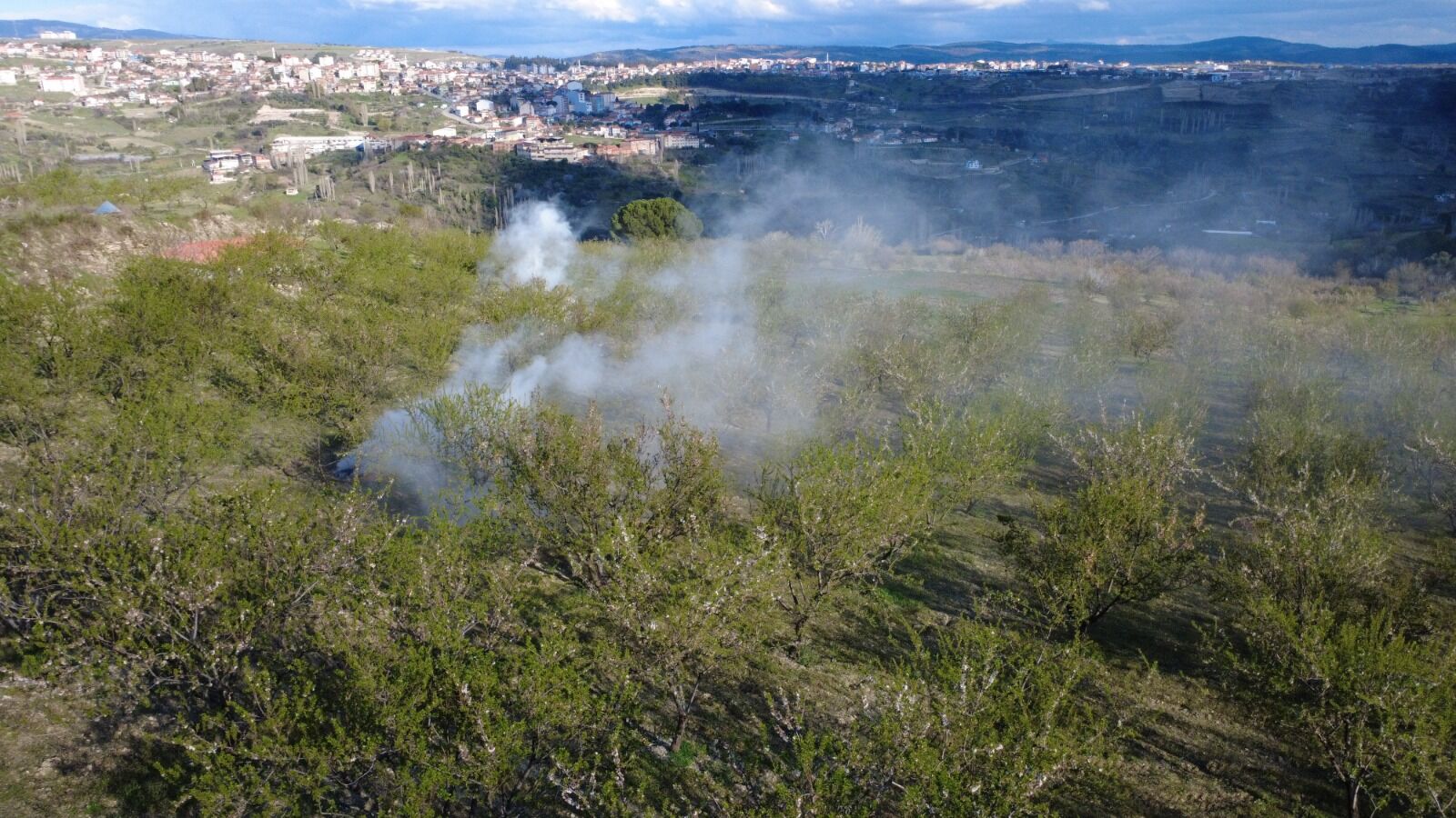 Gece saatlerinde sıcaklığın eksi 3 dereceye kadar düştüğü bölgede üreticiler, yaktıkları materyallerden çıkan yoğun duman sayesinde bahçe içerisindeki sıcaklığı sıfır derece civarında tutarak filizlerin donmasını önlemeye çalışıyor.