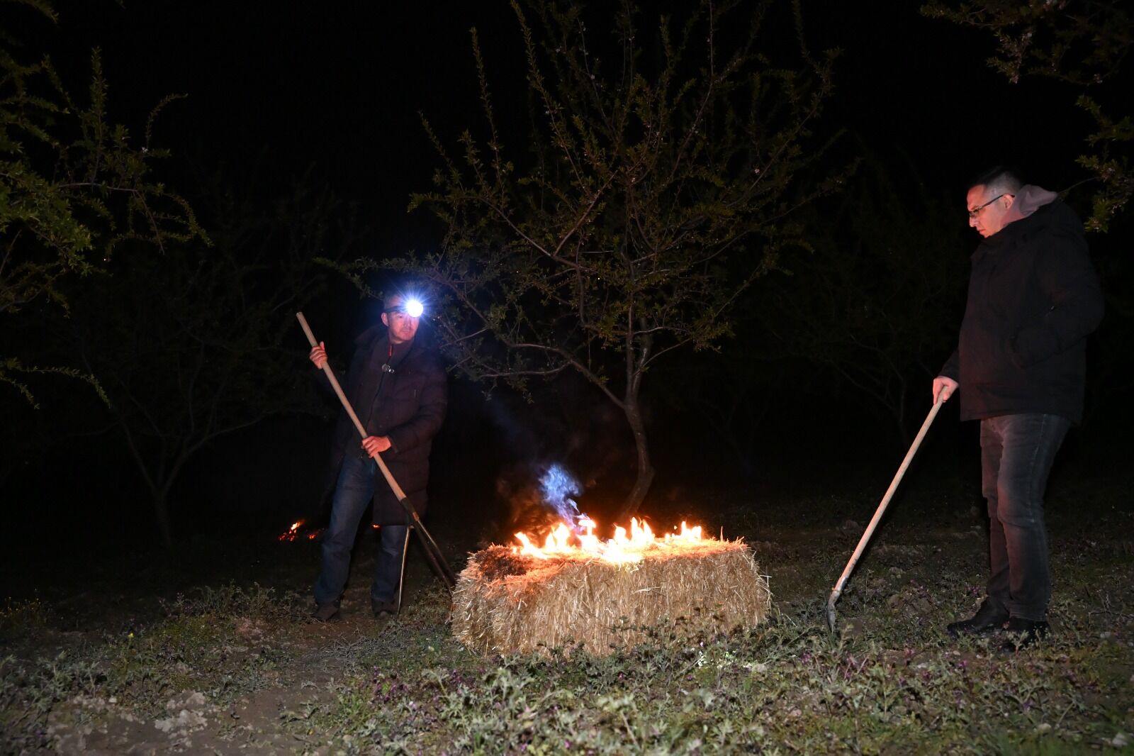 Meteoroloji verilerine göre 11 Nisan tarihine kadar sürmesi beklenen soğuk hava dalgasına karşı çiftçiler, akşam saatlerinden itibaren bahçelerinde dumanlama çalışmalarına başlıyor. Gece boyunca süren bu çalışmalar, sabahın ilk ışıklarına kadar devam ediyor.