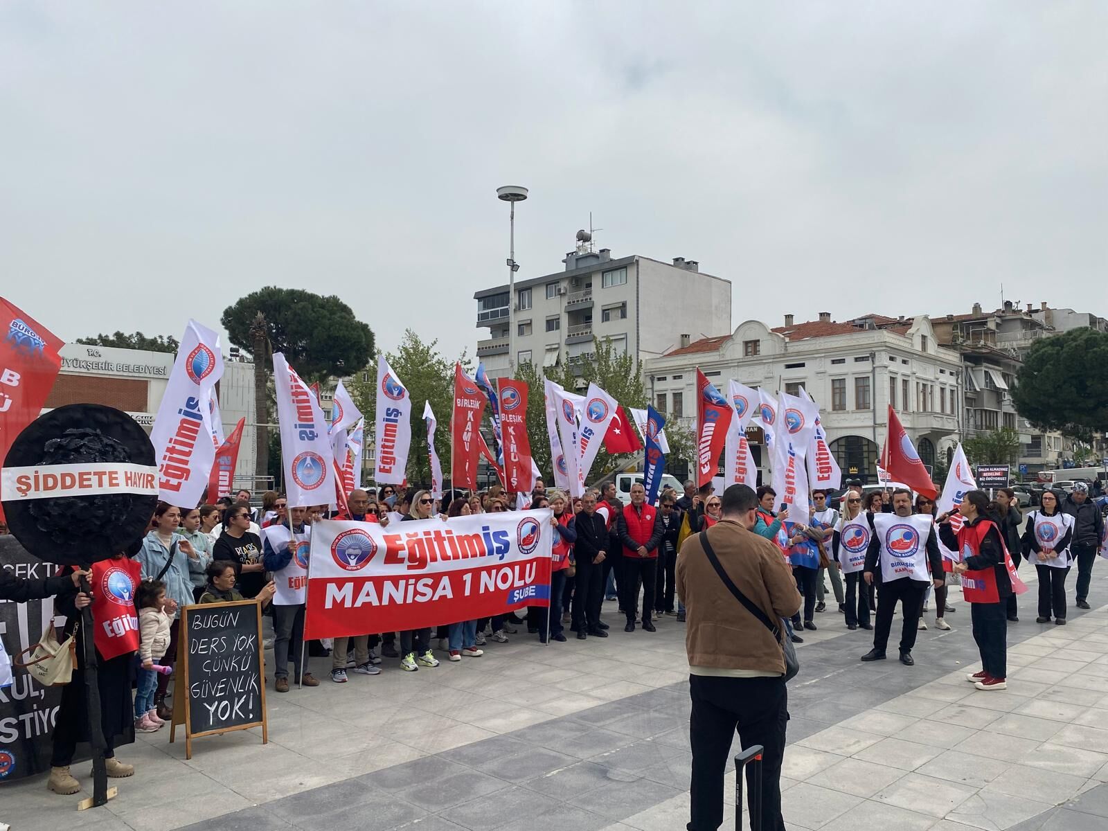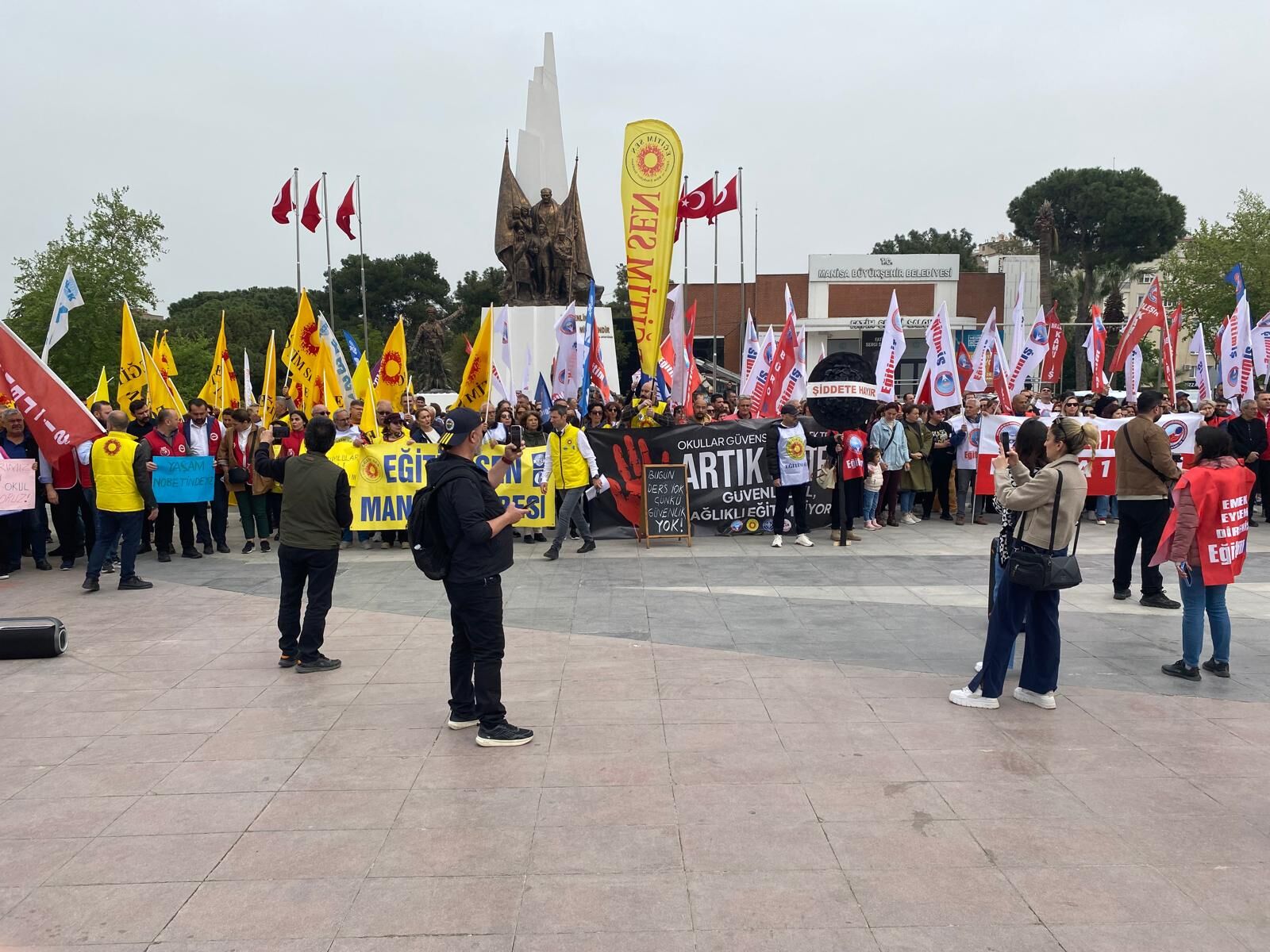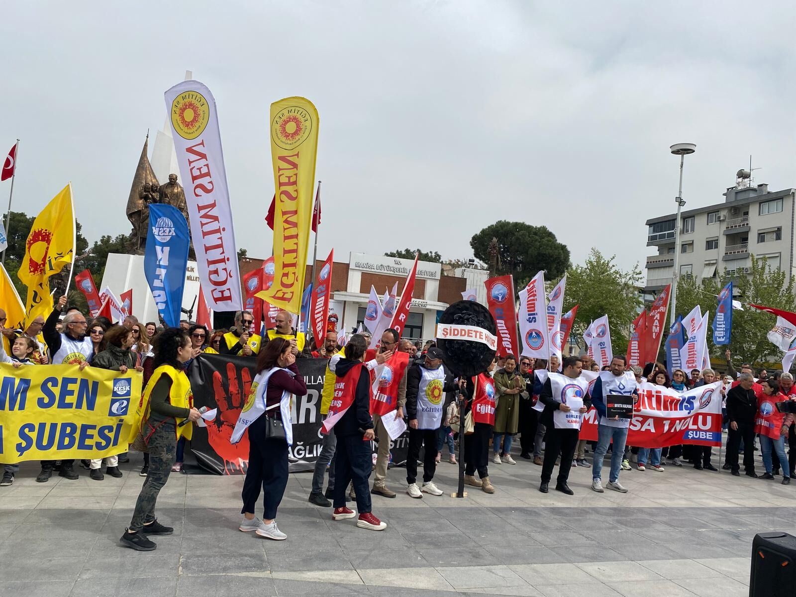 Eğitim-İş ve Eğitim-Sen üyeleri, protesto eylemlerinin ilk ayağında Şehzadeler İlçe Milli Eğitim Müdürlüğü binası önüne siyah çelenk bıraktı. Çelenk bırakma töreninin ardından Cumhuriyet Meydanı’nda toplanan kalabalık, Milli Eğitim Bakanı Yusuf Tekin’i istifaya davet ederek "Okullarda can güvenliği istiyoruz" sloganları attı.